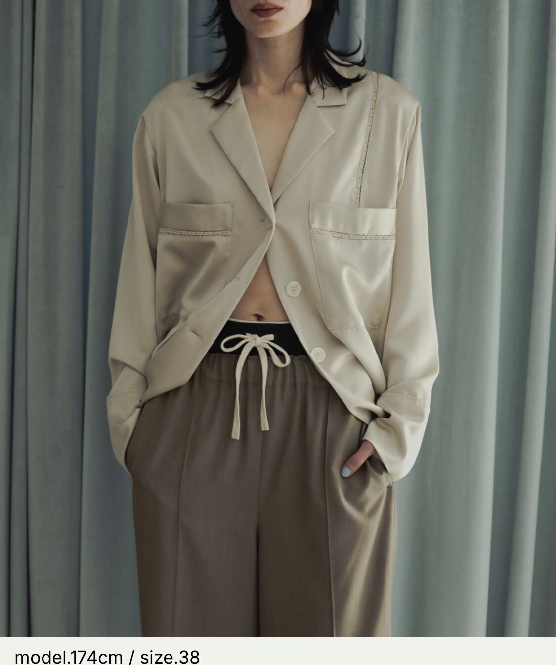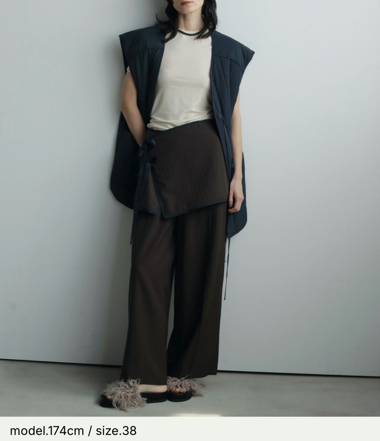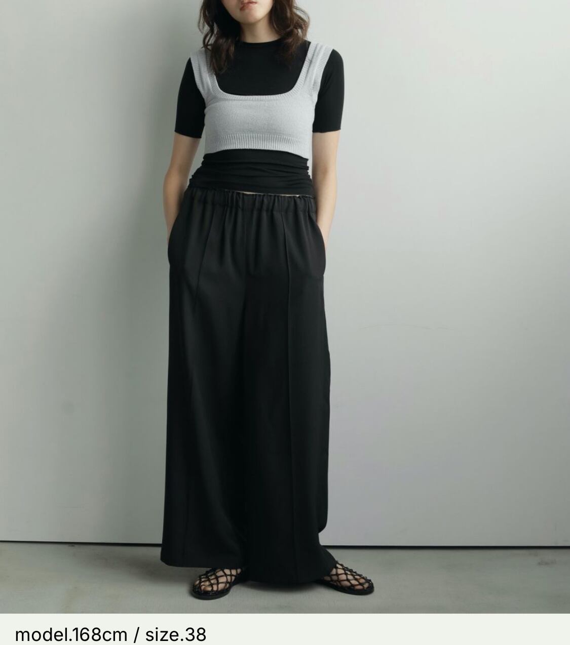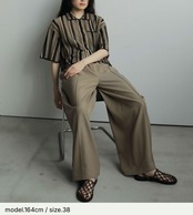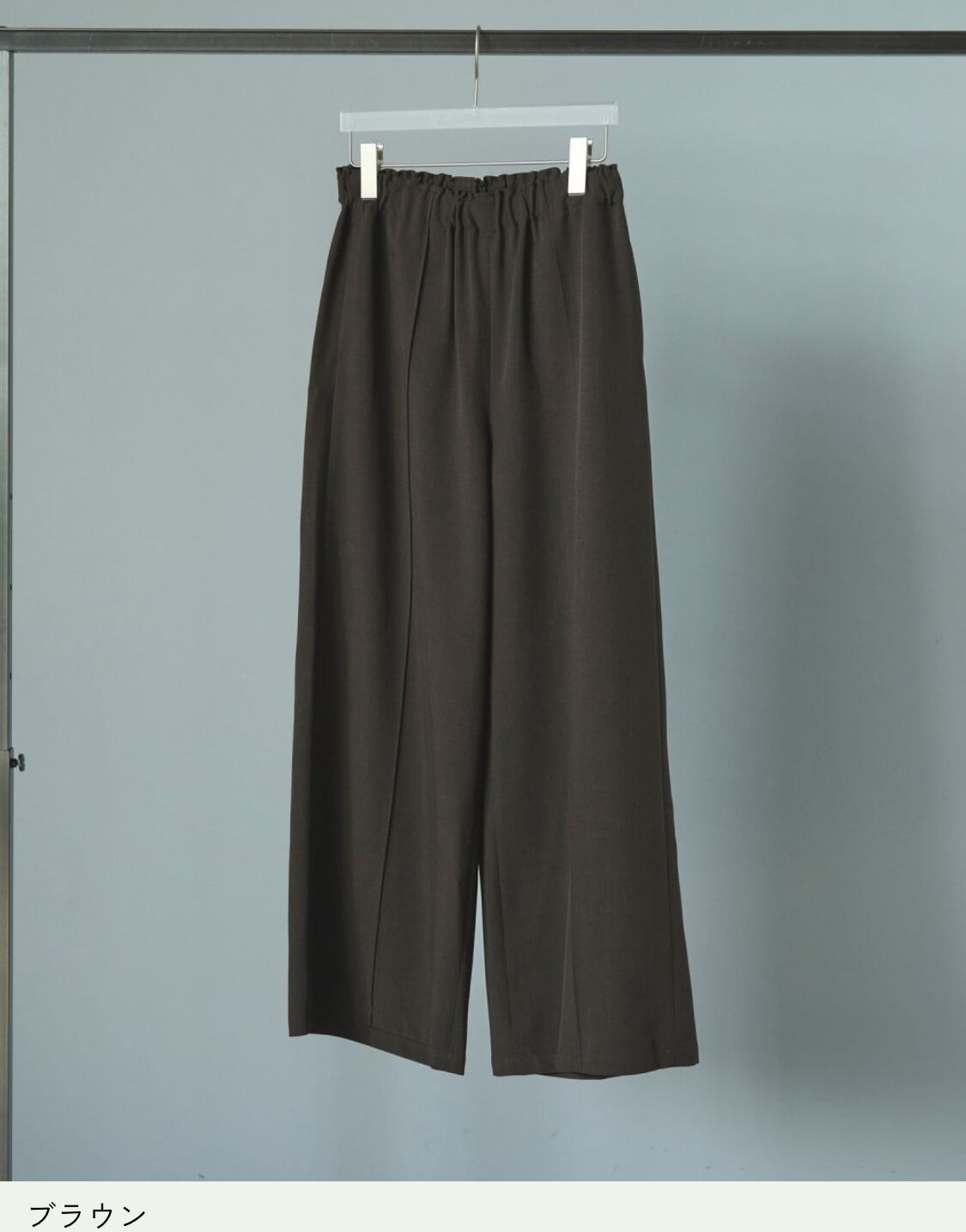 ウエストゴムでラフに履いていただけるワイドパンツ。ドライタッチで落ち感のある綾目素材を使用し、イージーに履けながら上品見えする一本です。ブラウンとベージュは杢調で、ニュアンスがある生地です。ピンタックのセンターラインを入れ、スッキリとした印象に履けるワイドシルエット。ウエストの内側には共布紐が通っているので、お好みのサイズに調節可能です。ローウエストで履いて、Rib Biker Pantsをウエストからチラ見せしたレイヤードスタイルもおすすめです。