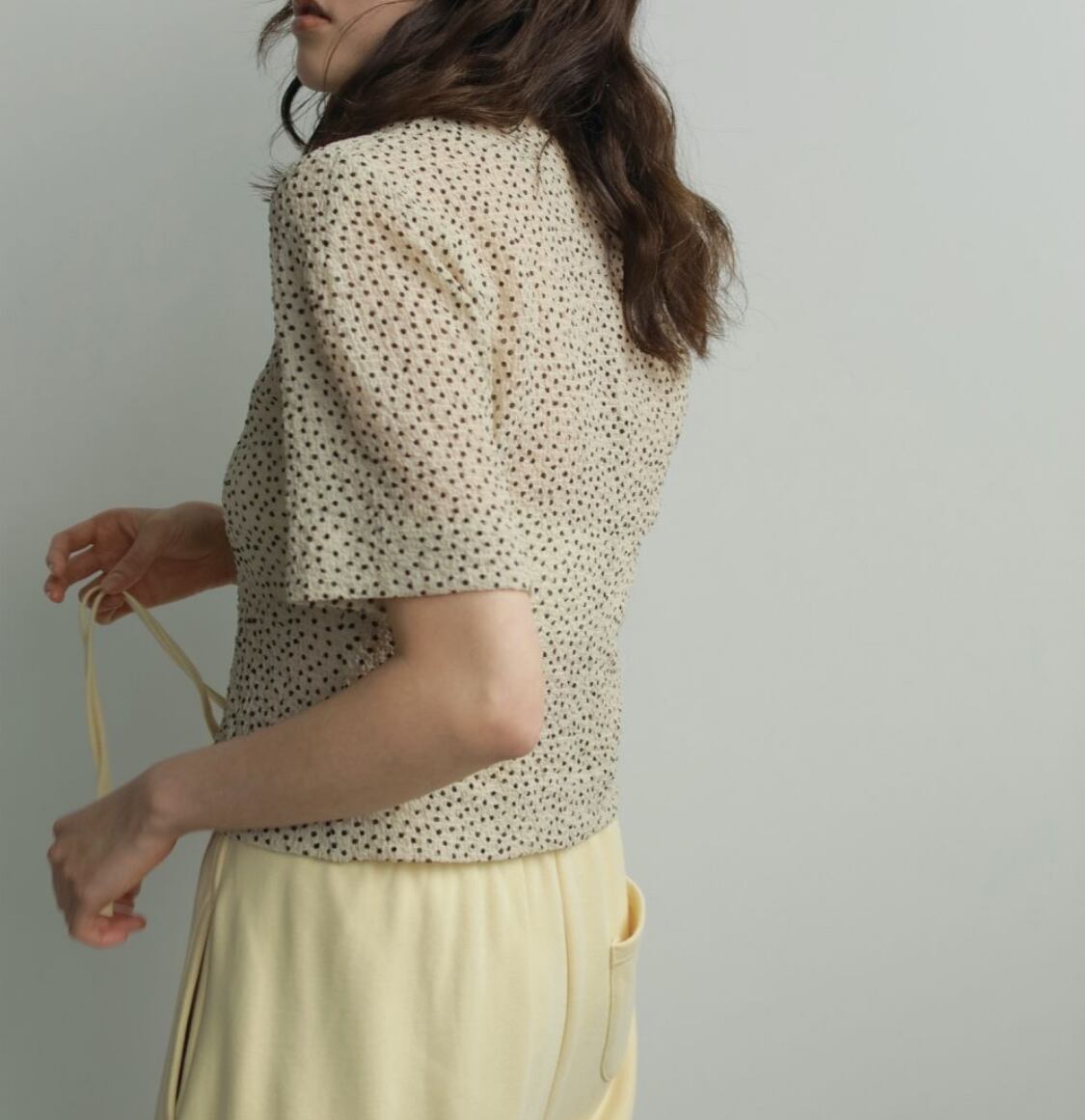 細かなドット柄がスタイリングに品良く映える半袖ブラウス。しぼ感のある表情豊かな素材で、さらりと心地良く肌に寄り添います。デコルテを美しく見せる深過ぎない上品なVネックと、程良くコンパクトな着丈で、女性らしい佇まいを引き立てる一着。