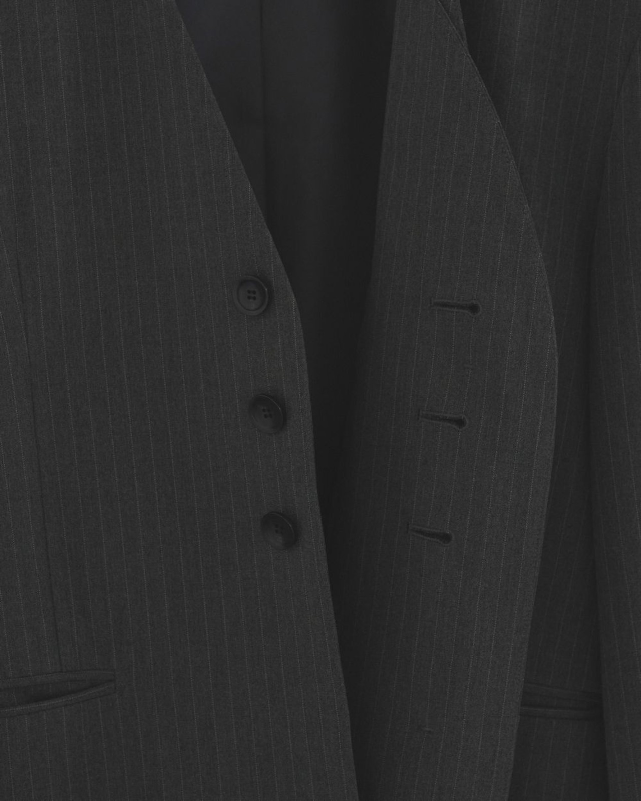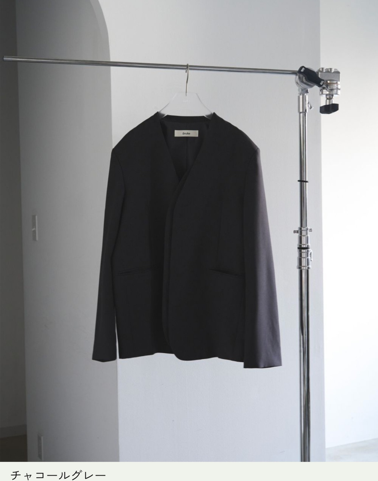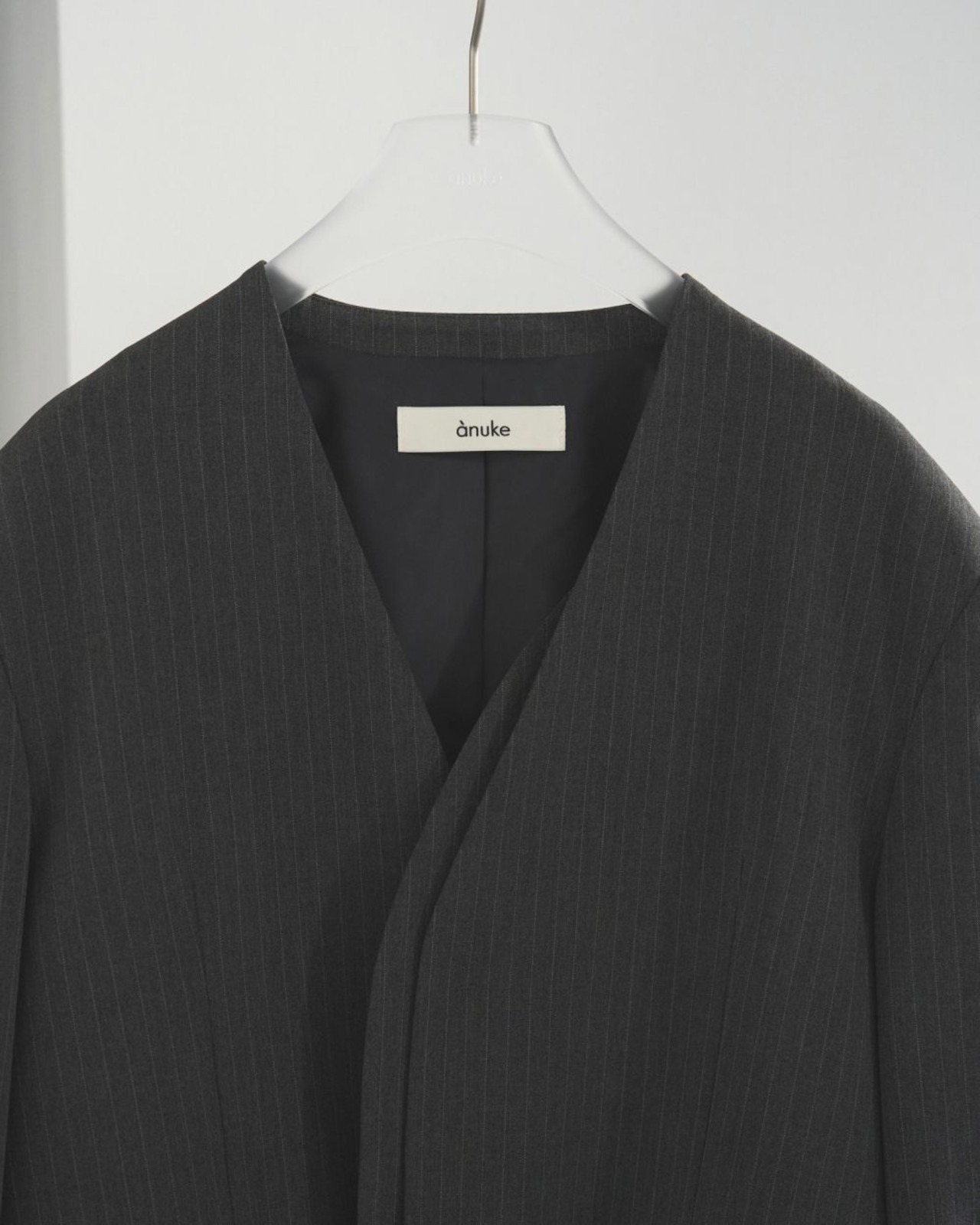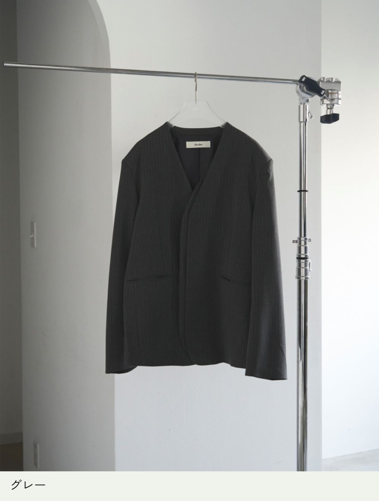 ストレッチ性のある平織りの杢調素材で仕上げたノーカラージャケット。しわになりにくい、肌触りの良い素材です。左身のフロントを2枚重ねたディテールがポイント。前を閉じるとボタンが見えず、ポケット口は細めの両玉縁ポケットでスッキリと仕上げています。ミニマルなデザインながら、重なったフロントデザインがスタイリングのアクセントに。同素材のHeather Stretch PantsやHeather Stretch Middleskirtとセットアップで着るのもおすすめ。グレーは細ラインのストライプ素材。チャコールグレーは少しブルー味のあるなんとも言えない絶妙な色合いで、着るだけで洒落感の出るカラーです。