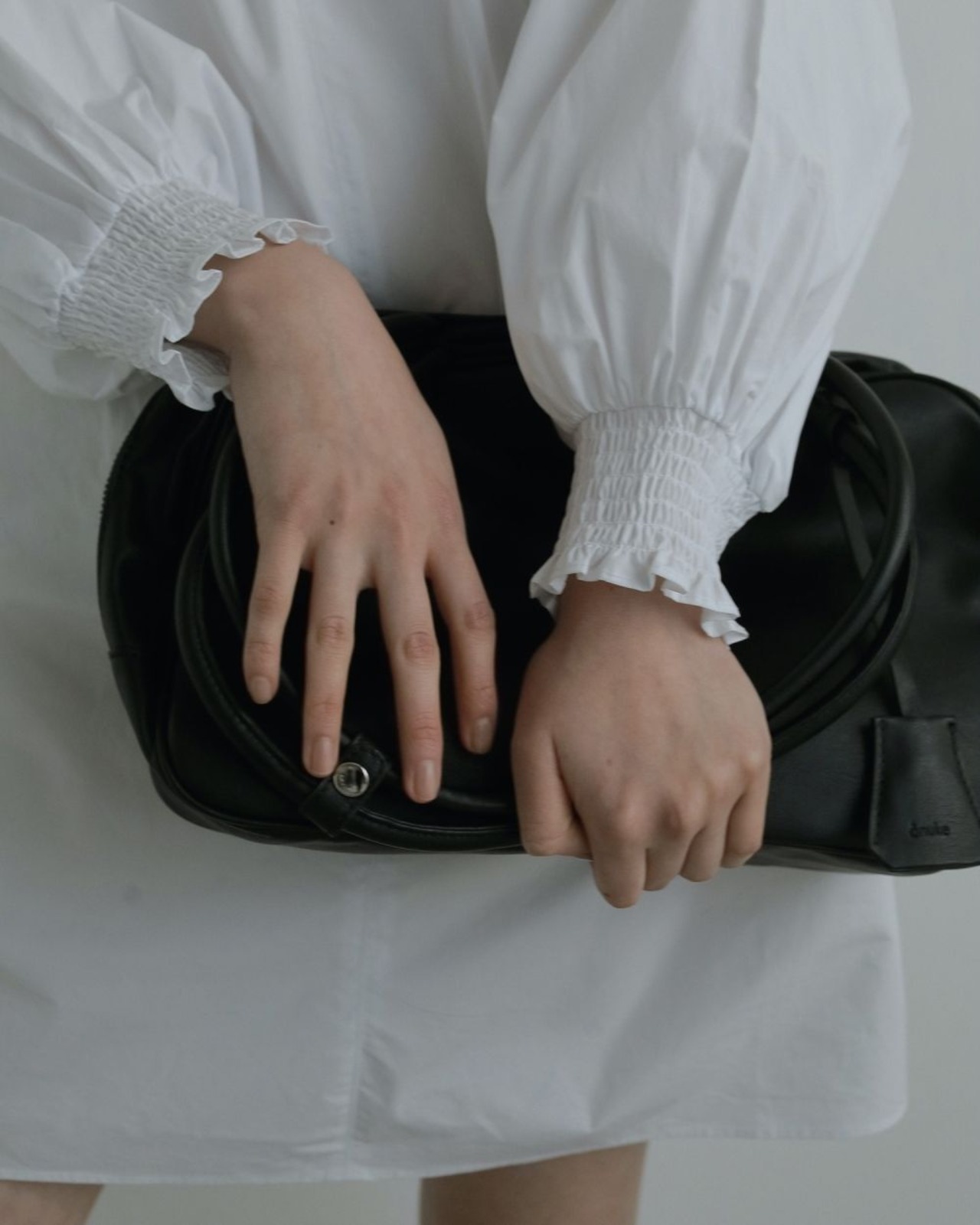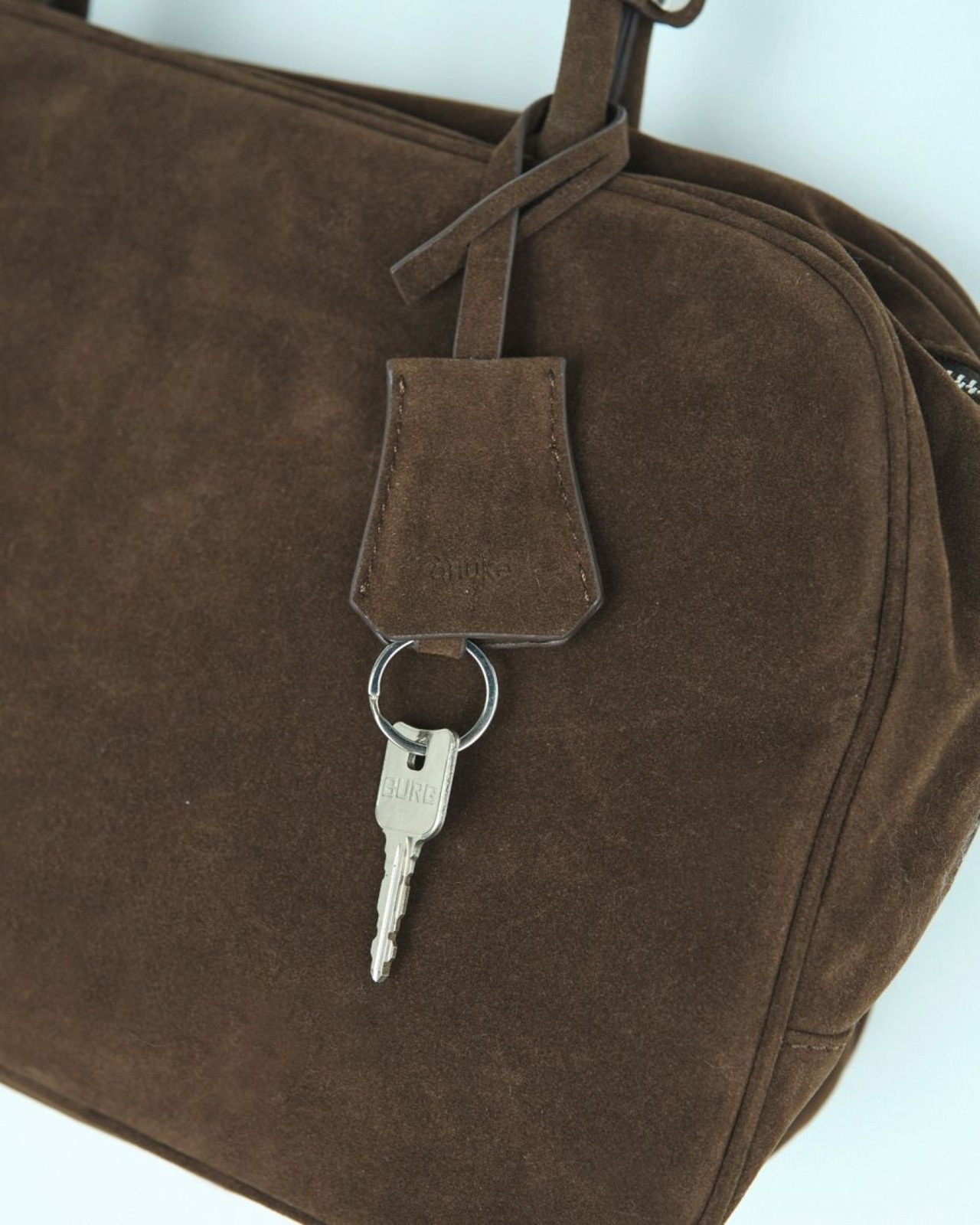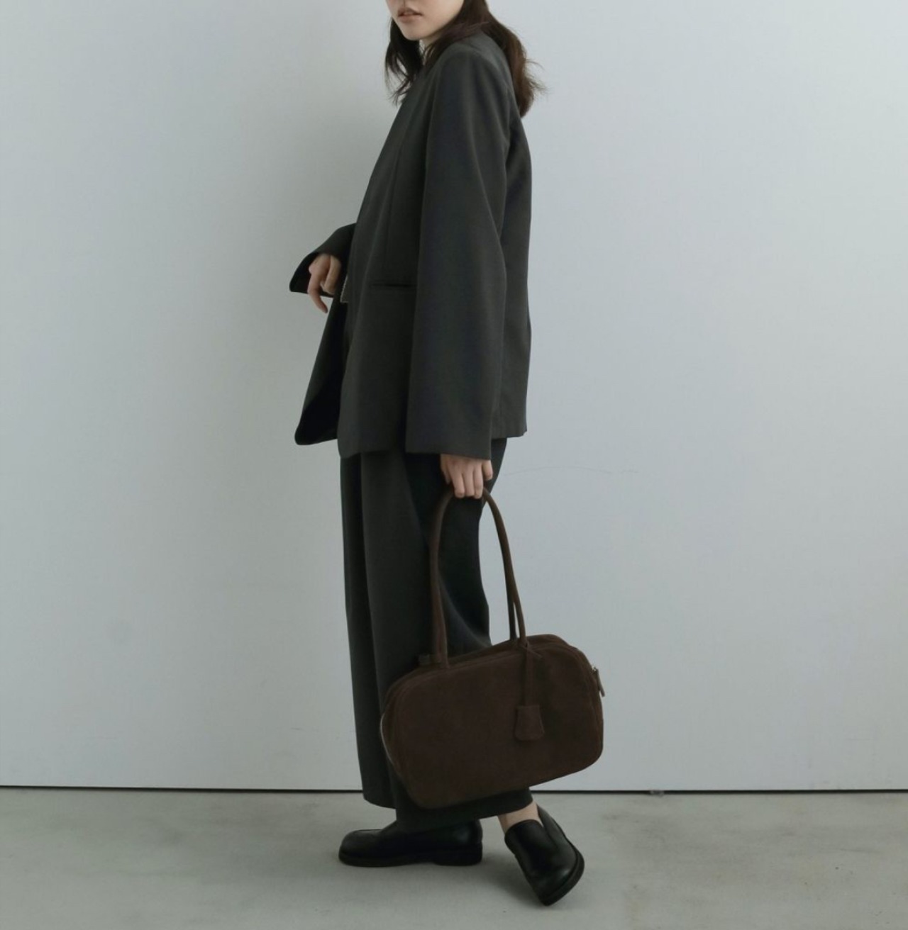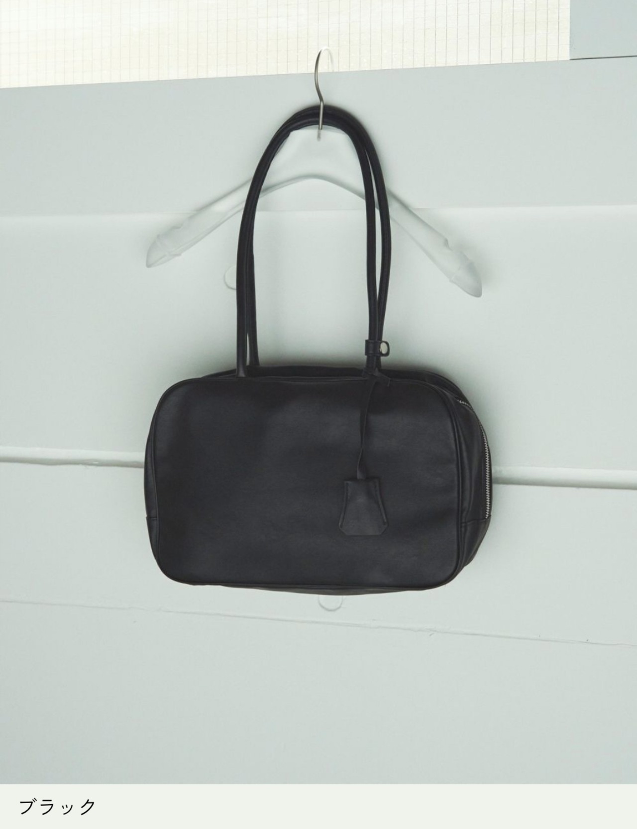 程良い大きさで日常使いしやすいボストンバッグ。横長のボックス型で、13インチ程度のパソコンが入るサイズ感です。ショルダー紐はゆったりとしたアウターを着ても肩掛けしやすい長さなのもポイントです。内側には、ファスナー付きポケットと二つに分けられるポケット付きで、細かなアイテムも入れやすいです。外側は取り外し可能な、共生地のキーケースがついています。ブラウンはマットなエコスエード素材、ブラックはフラットなエコレザー素材を使用しています。