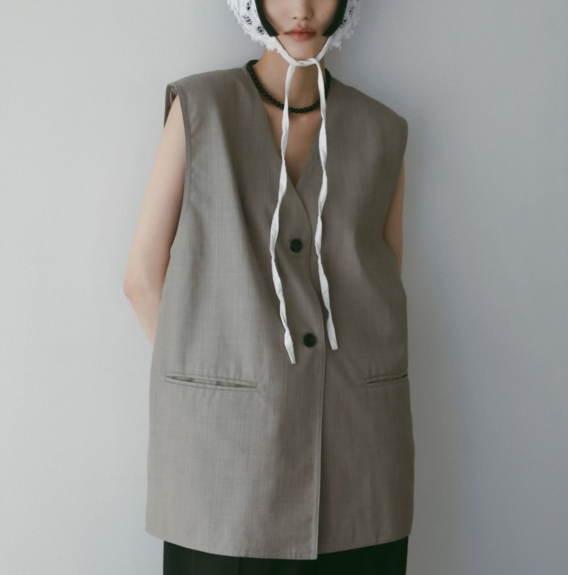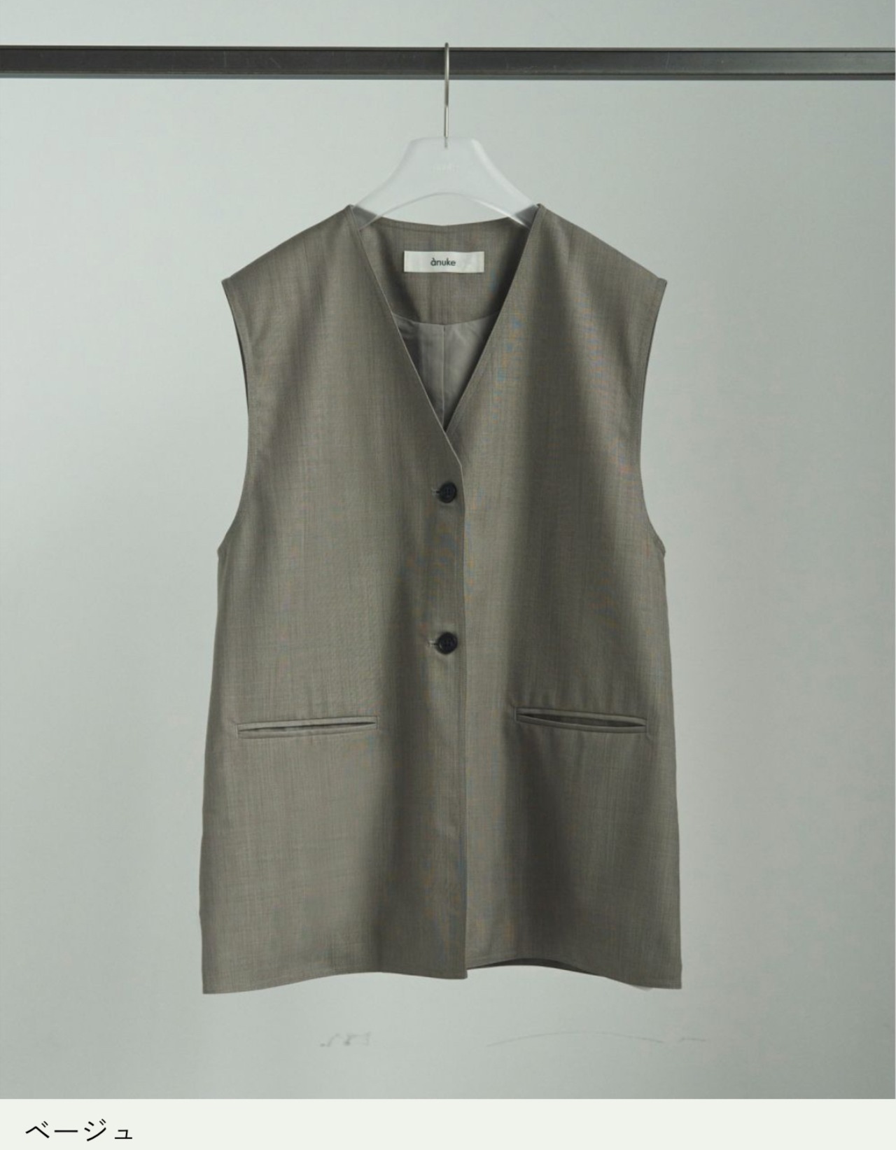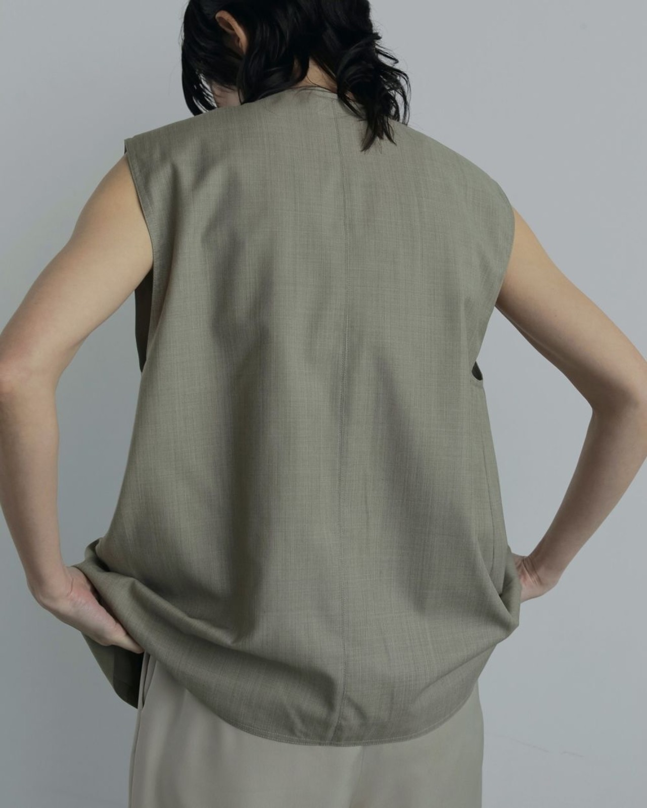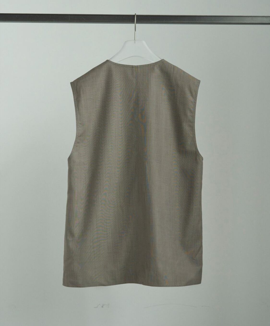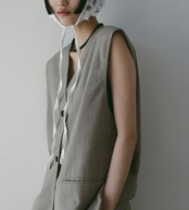 程良くゆるめのシルエットでミニマルなデザインで仕上げたVネックベスト。サラッとした風合いのウール混の杢調素材で、大人っぽく着ていただける一枚です。レイヤードしたり、フロントボタンを閉じてプルオーバーとして着るのもおすすめ。同素材のCenterpress Half Pantsとのセットアップスタイルも楽しんでいただきたい。
