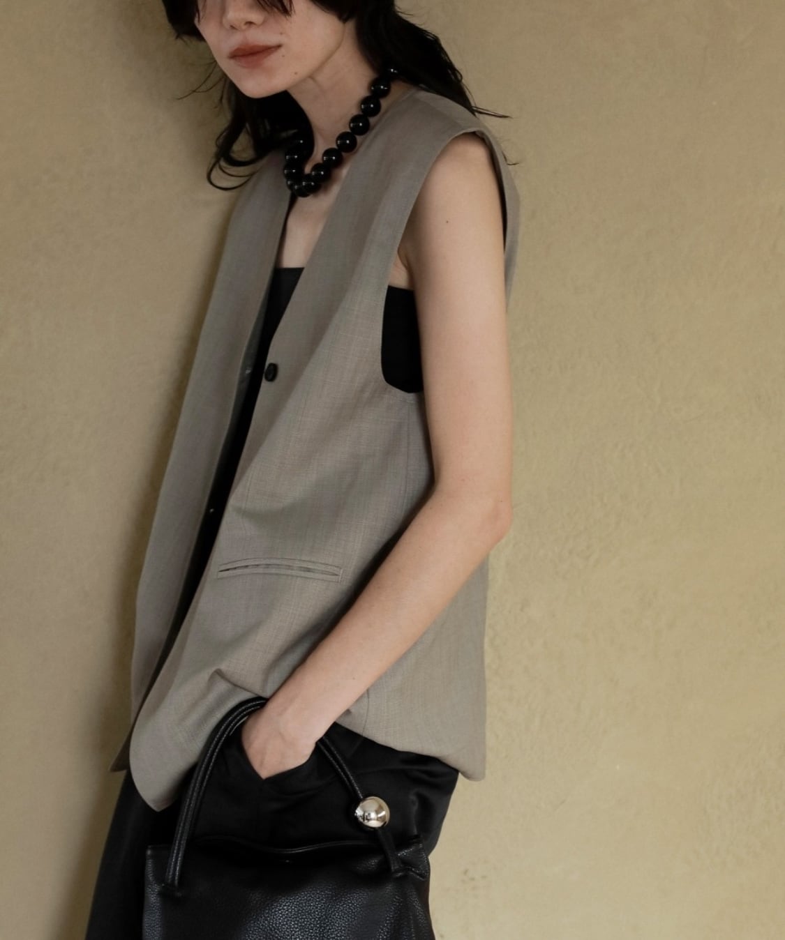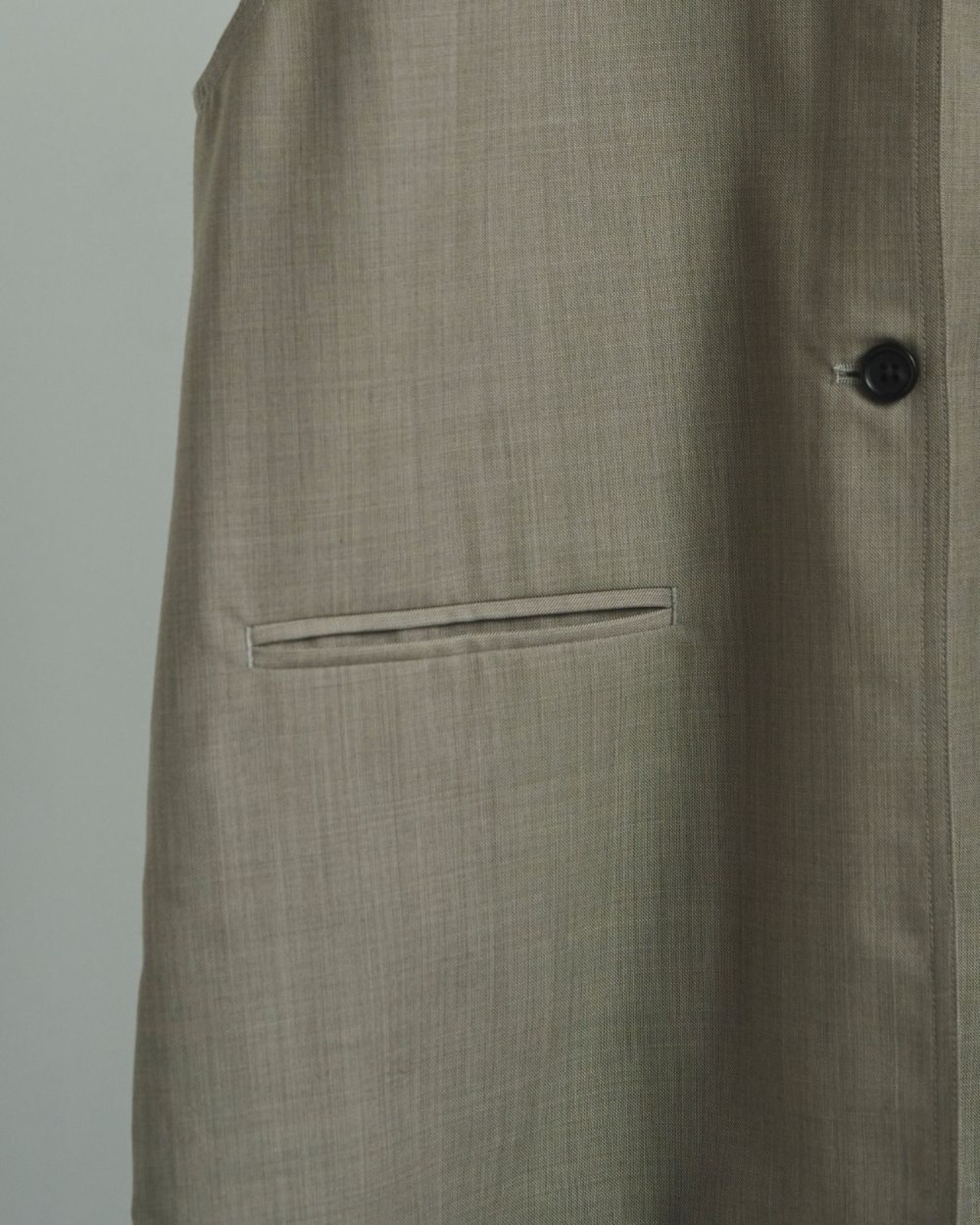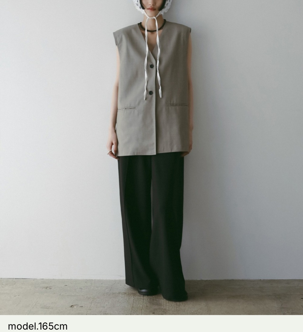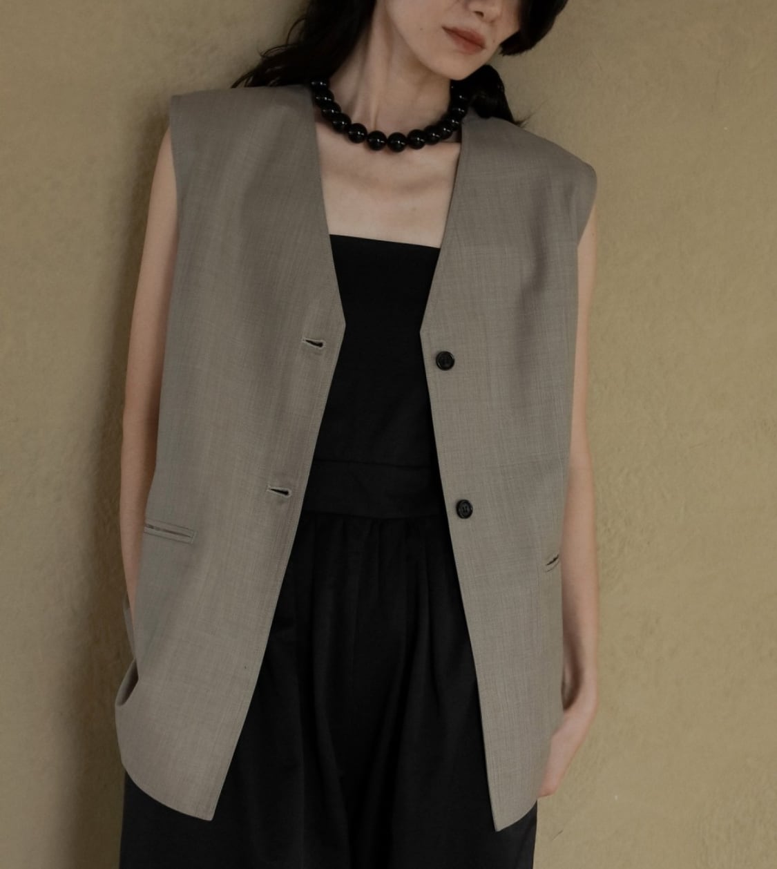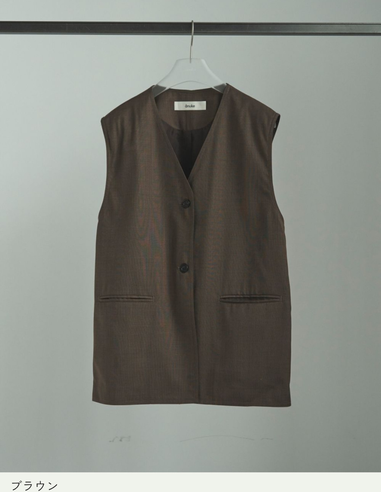 程良くゆるめのシルエットでミニマルなデザインで仕上げたVネックベスト。サラッとした風合いのウール混の杢調素材で、大人っぽく着ていただける一枚です。レイヤードしたり、フロントボタンを閉じてプルオーバーとして着るのもおすすめ。同素材のCenterpress Half Pantsとのセットアップスタイルも楽しんでいただきたい。