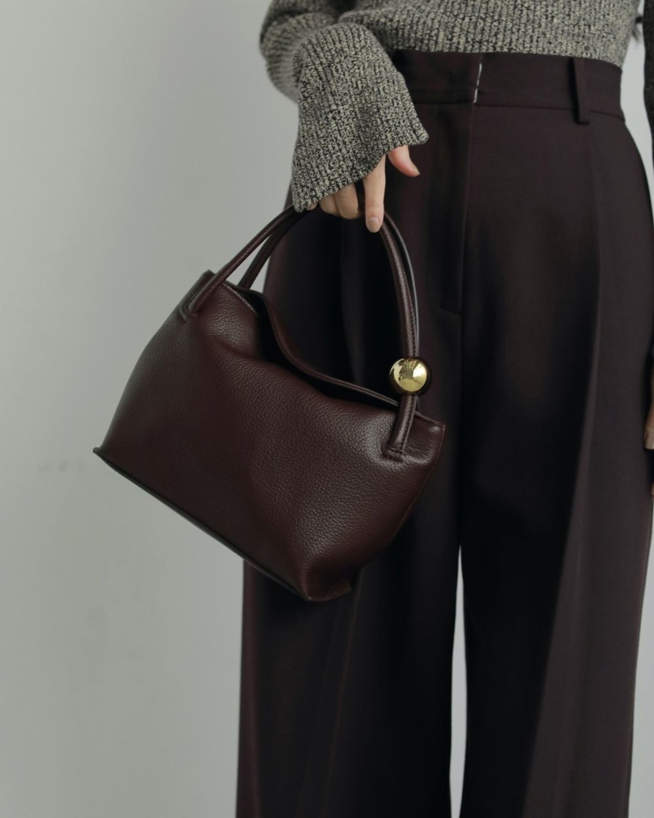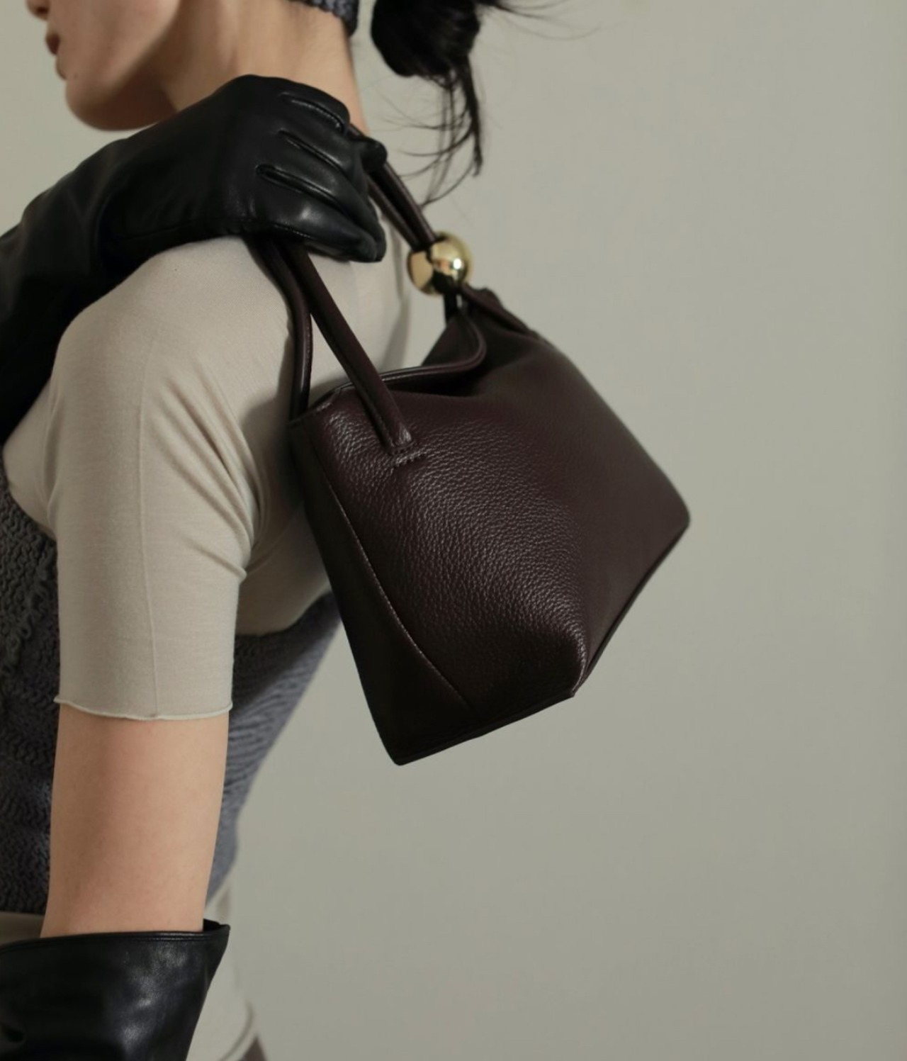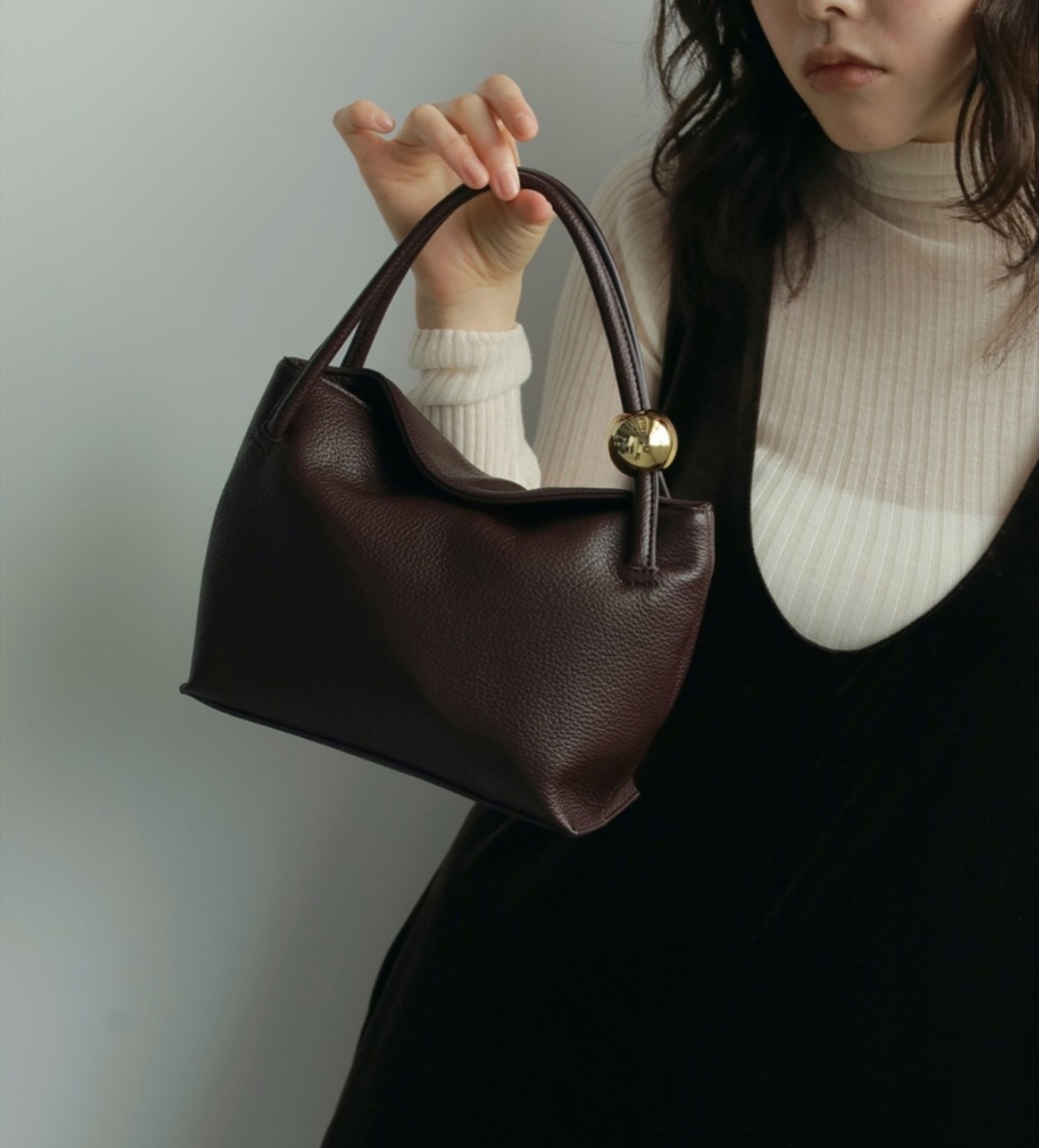 目を惹く大きめのメタルボールがポイントになったミニバッグ。小ぶりなサイズで、綺麗目にまとめたいオケージョンシーンなどにも活躍します。ブラックはシルバー、ブラウンはゴールドのボールパーツが付いています。少ししぼ感のあるエコレザー素材を使用し、柔らかく手に優しくフィットします。同素材のEcoleather Waist Pouchを持ち手に付けてセットで使っていただくのもおすすめです。