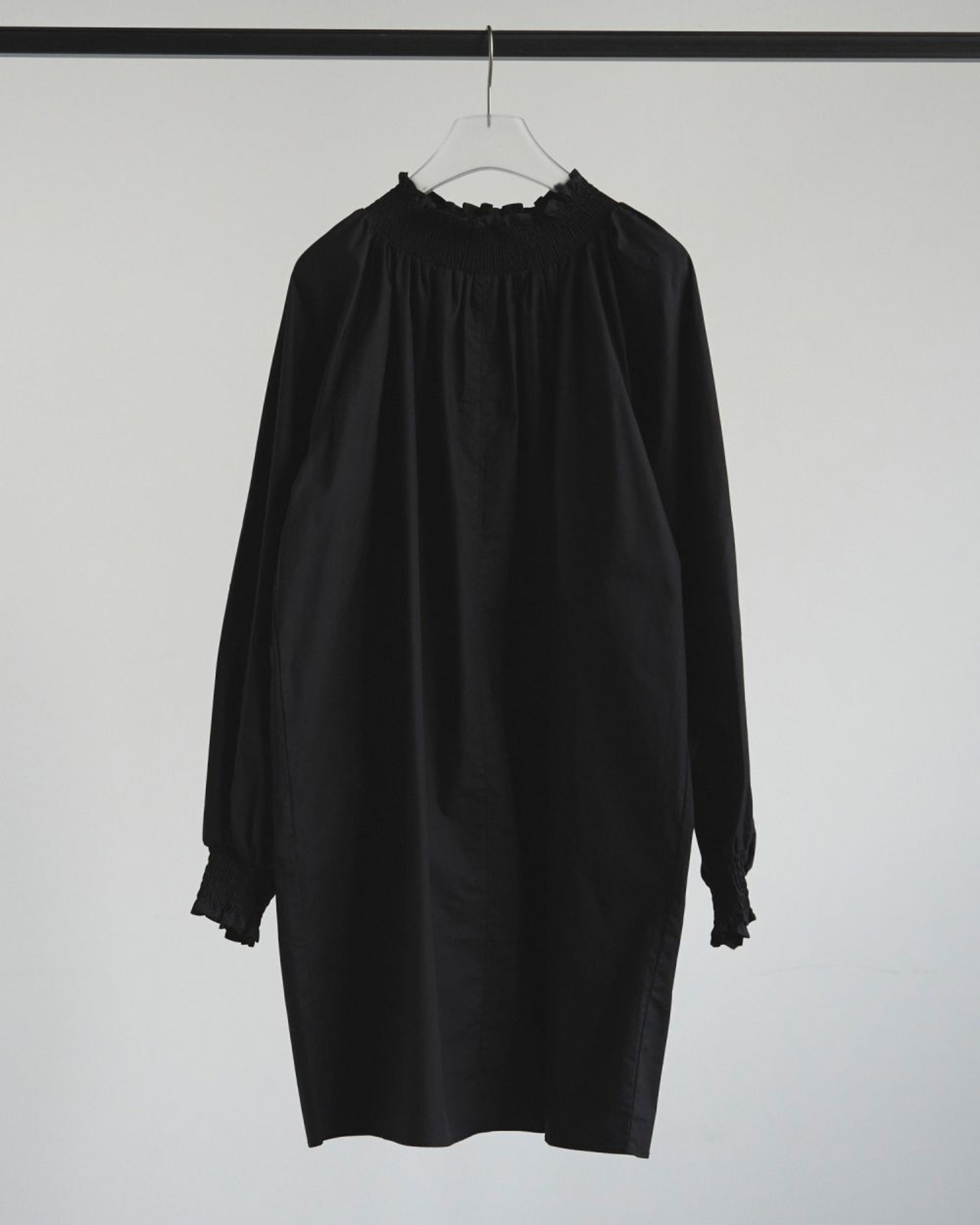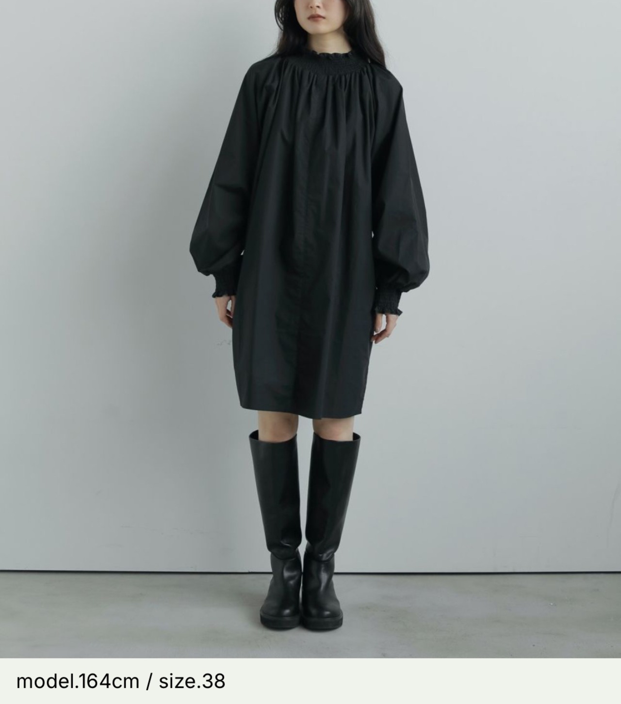 襟元と袖口にたっぷりと入ったシャーリングギャザーがポイントのミニワンピース。ふんわりとした袖のシルエットと、ゆったりとしていながら程よくスッキリと着れるボディのシルエットが女性らしく決まる一枚。ゴム仕様の袖は、たくし上げて袖丈を短くしてたぽんとたまるボリューム袖として着ていただくのも可愛いです。今っぽいミニ丈で、ロングブーツとぜひ合わせていただきたい一着。オーバーなジャケットなど少しメンズライクな羽織と合わせた着こなしもおすすめです。