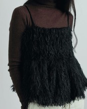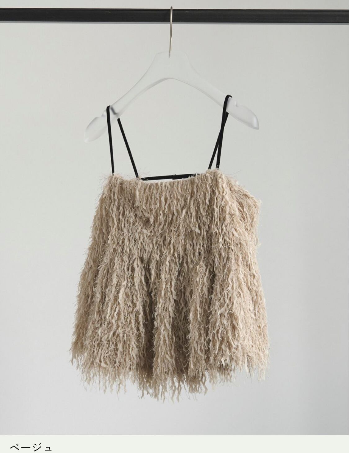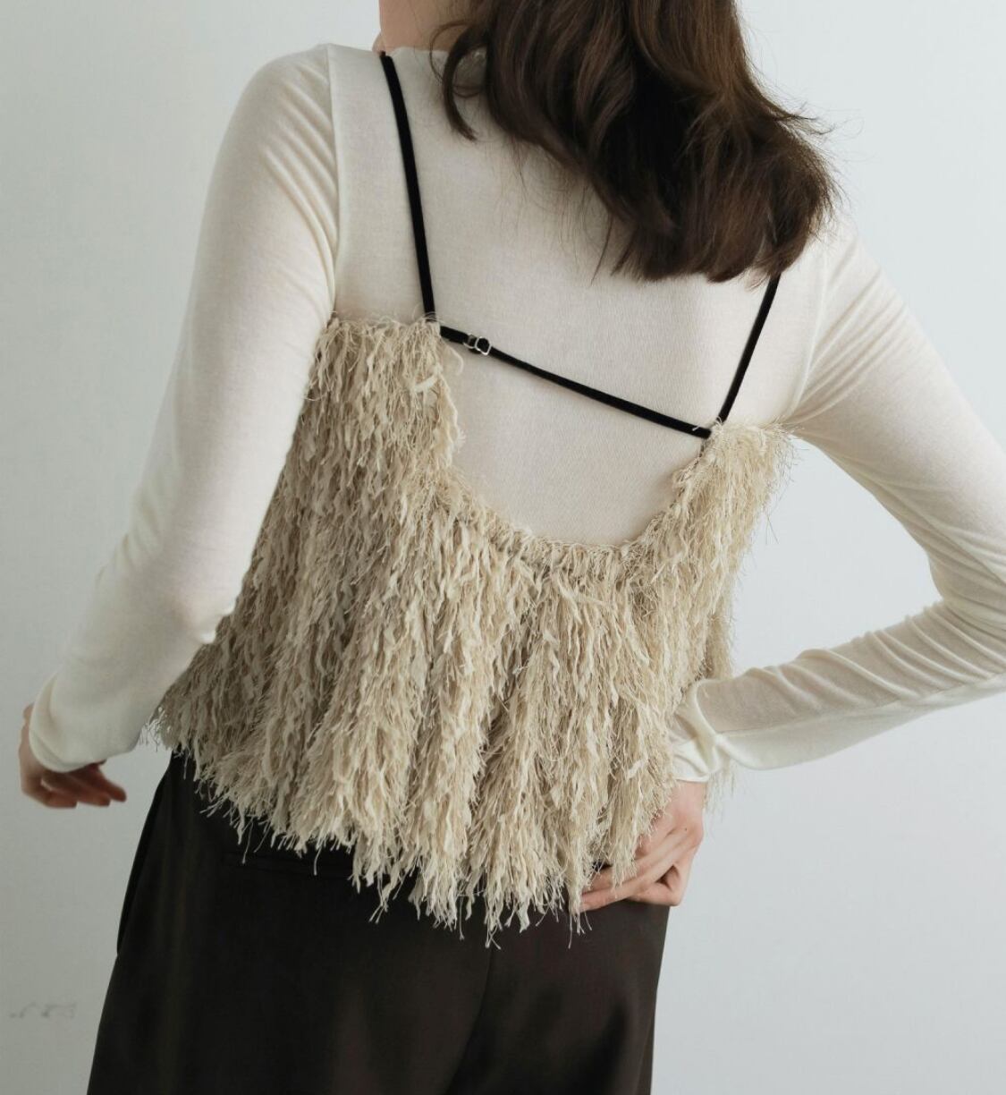 ふわふわと揺れるフェザー素材が魅力のキャミソールトップス。細い糸と羽根のようなテープがミックスされた素材で、軽くて柔らかい風合いです。ベロアのテープ使いとバックオープンデザインがポイント。シンプルなトップスとレイヤードするだけで、スタイリングが一気に華やぐ一着。フェミニンなコーディネートにはもちろん、あえてラフなドロストパンツと合わせていただくのもおすすめ。スラックスやスッキリとしたサテンスカートなどと合わせるとより綺麗目な印象になり、オケージョンシーンなどにも活躍する一枚です。
