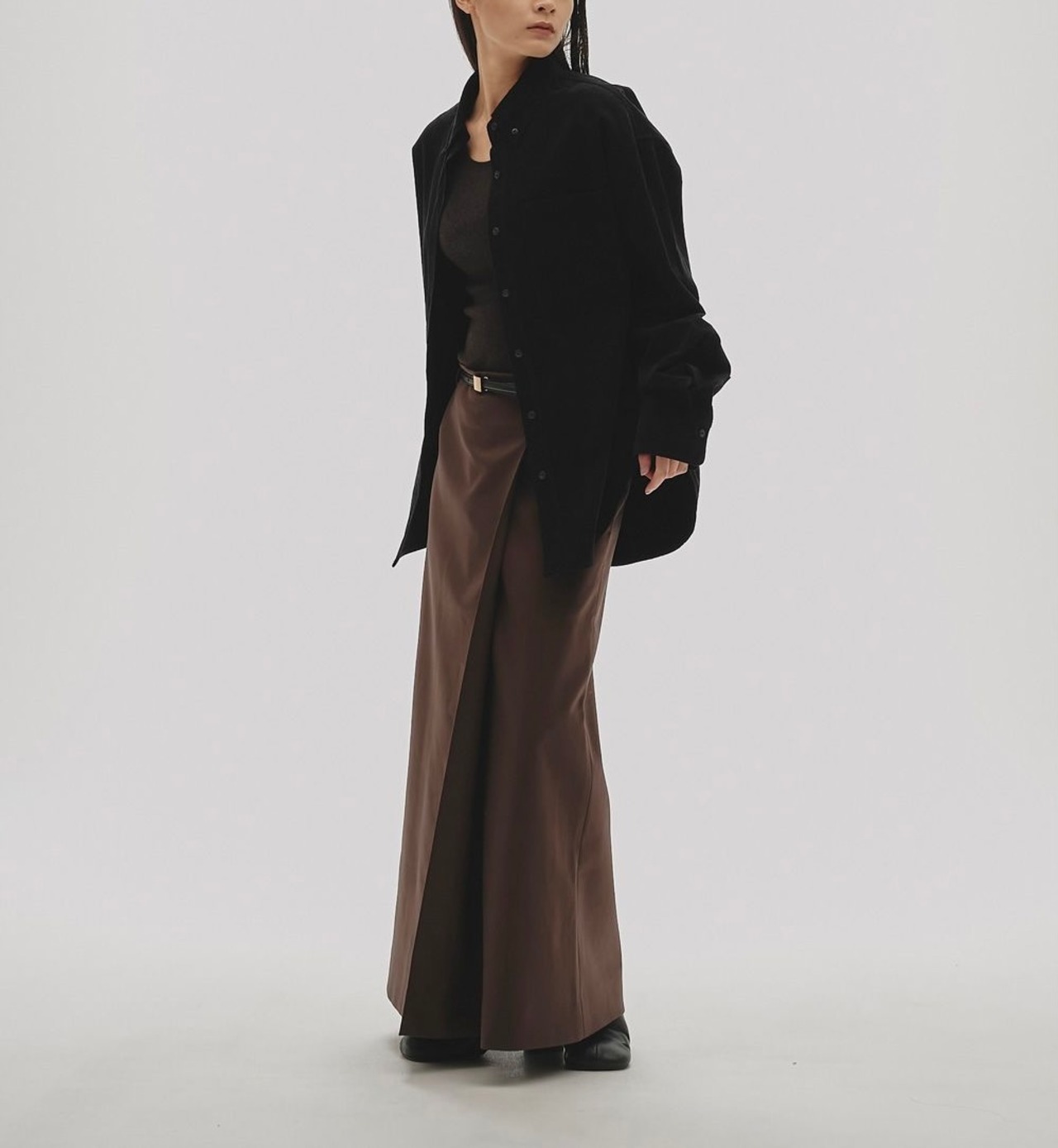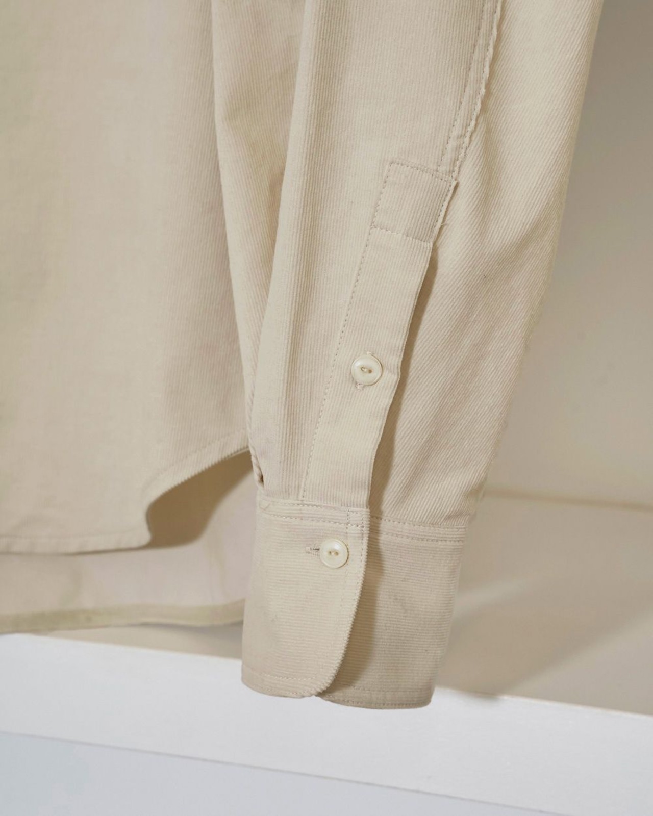 柔らかい質感で細めのラインが特徴のコーデュロイ生地を使用したシャツ。ヨークの3本ステッチや、あえてはみ出したポケットのステッチなど、シンプルながらも遊び心のあるディテールが魅力。シルエットを選ばず着回しやすく、さらっと一枚で着るのはもちろん、程良くゆるいサイズ感なのでライトアウター感覚で羽織りとしても活躍する一枚です。