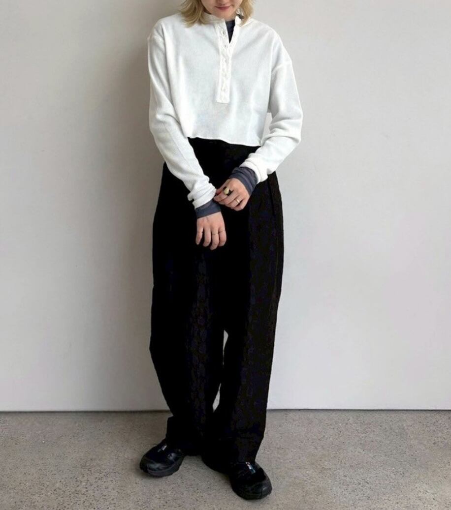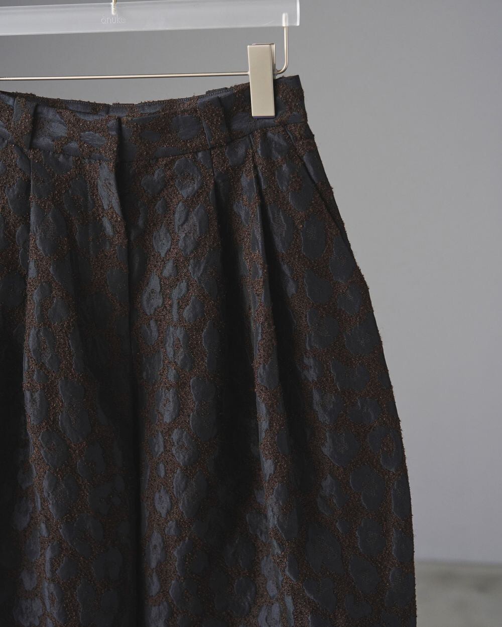 シックな配色で仕上げたレオパード柄パンツ。桐生で織り上げたオリジナルの国内素材。細いループ糸と微光沢糸を使い、立体感あるジャガード生地です。派手過ぎないレオパード柄で上品に着ていただけます。フォルムの出る少しハリのある素材で、ダブルタックを入れたコクーンシルエットに仕上げました。同素材のLeopard Jacquard JacketやLeopard Jacquard Vestとセットアップで着るのもおすすめです。
