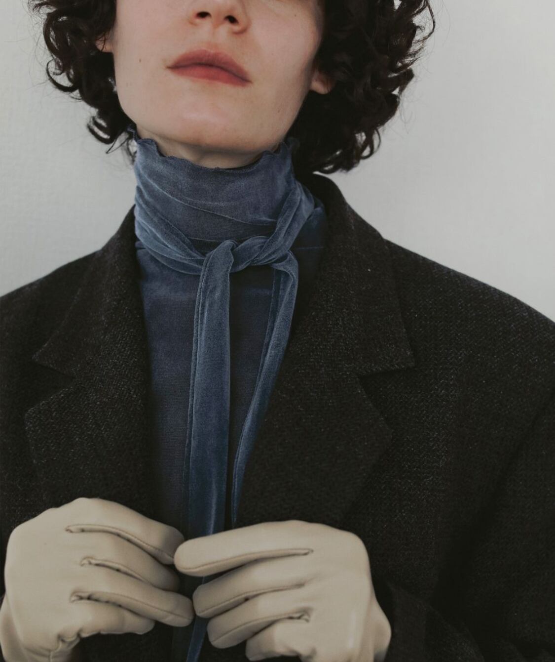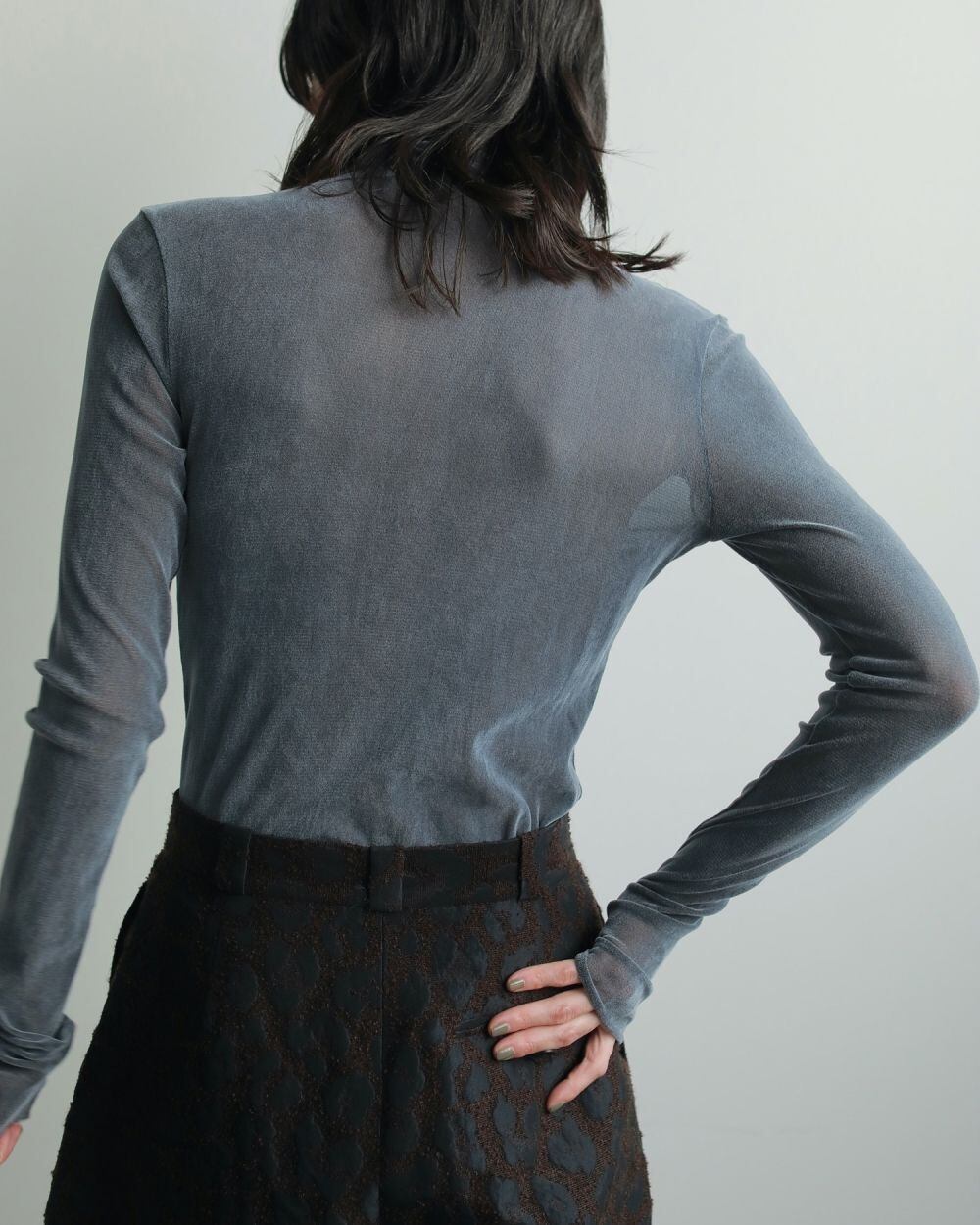 ストレッチチュールのベロアを使ったタイ付きのタートルトップス。タイをラフに結んでジャケットと合わせたバランスがおすすめ。裾や袖口、首元はメロウ仕上げでスッキリと仕上げています。シンプルなタートルトップスとしても着回せるので、ワンピースやビスチェとレイヤードした、タイを外した2通りのスタイリングを楽しんでいただけます。