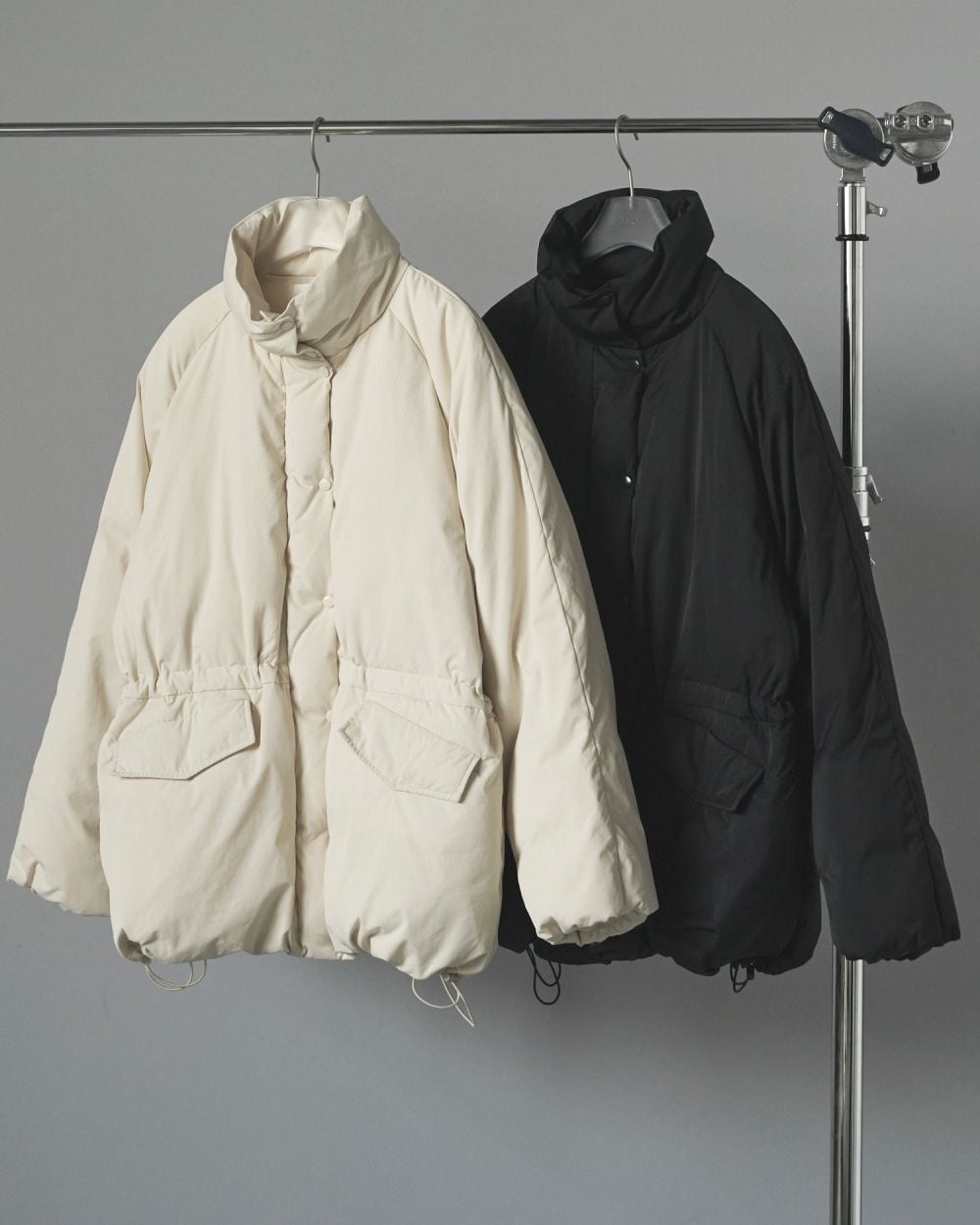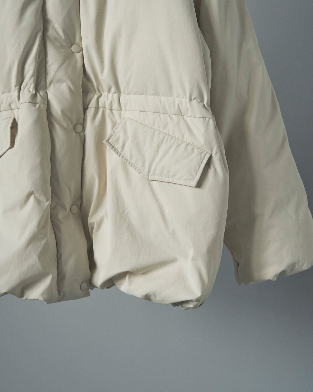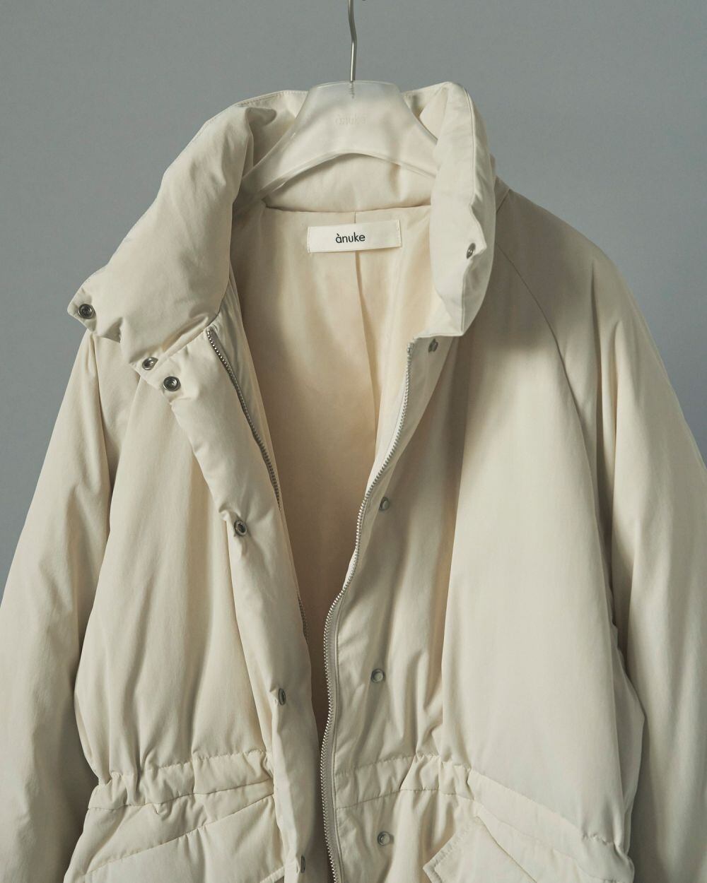 しなやかでマットな質感が上品見えする綾織素材で仕上げたスタンドカラーのダウンコート。腰回りがしっかりと隠れるミドル丈で、幅広いボトムと合わせやすく、ウエストや裾のドロストでシルエットをアレンジしていただけます。袖下と脇線に共布のパイピングを挟み込んでいるのもポイント。ベーシックなブラックと冬から春の始まりの寒い季節にも明るいトーンがマッチするアイボリーの2色展開です。