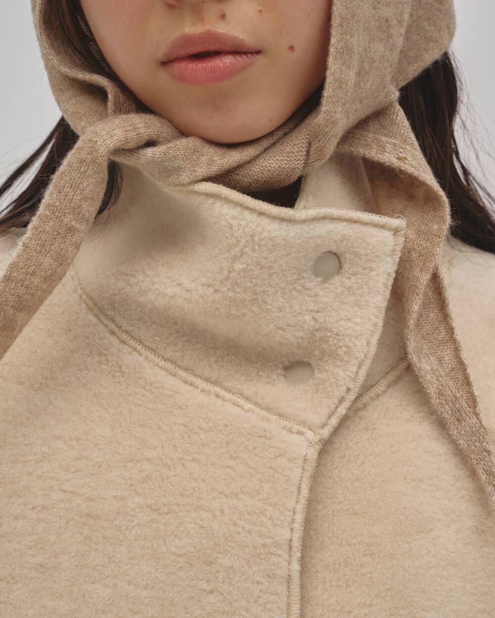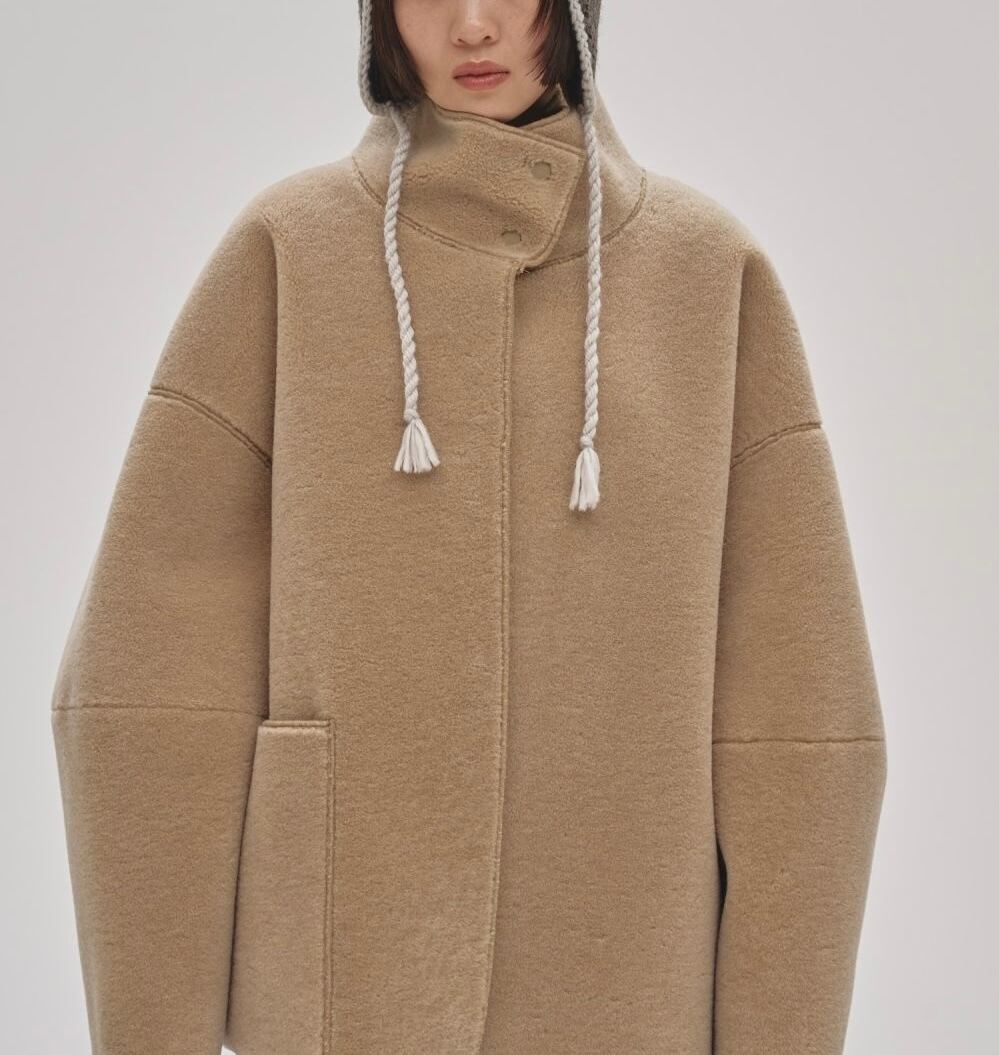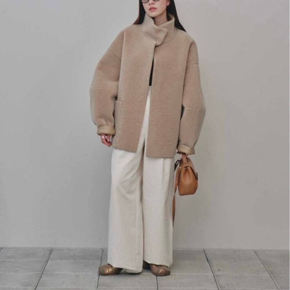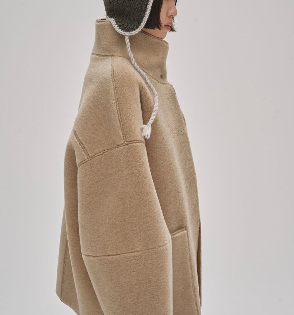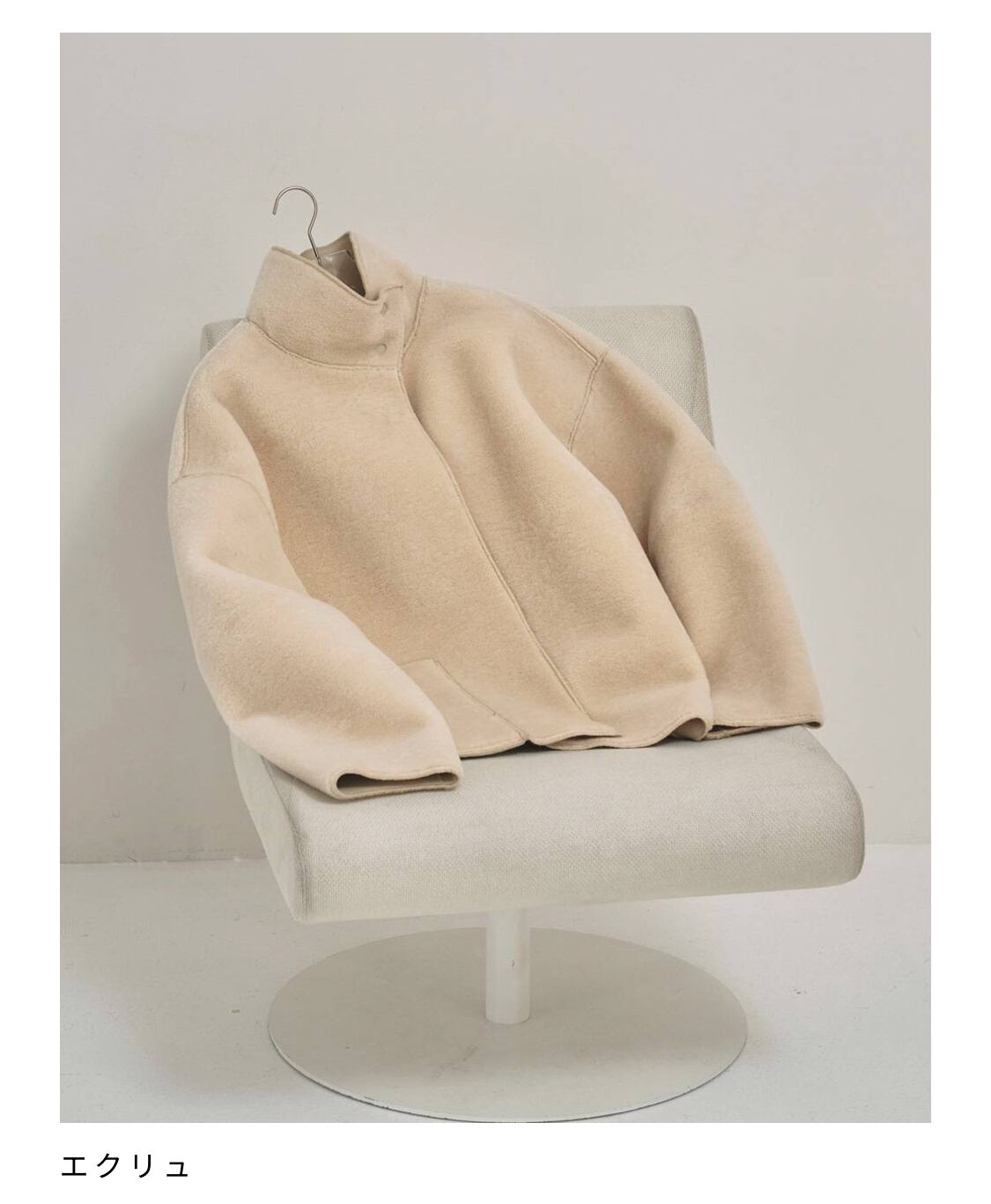 オリジナルで開発したボア生地を使用したジャケット。内側にフェイクレザーをボンディング加工することで、袖やサイドから見た際のシルエットに立体感をプラス。ヒップにかかる着丈は、ワイドボトムともバランスよく合わせられます。片側だけにあしらった大きめのポケットや、首元で留めるドットボタン、ステッチ使いなど、細部にまでこだわりが詰まった一枚です。