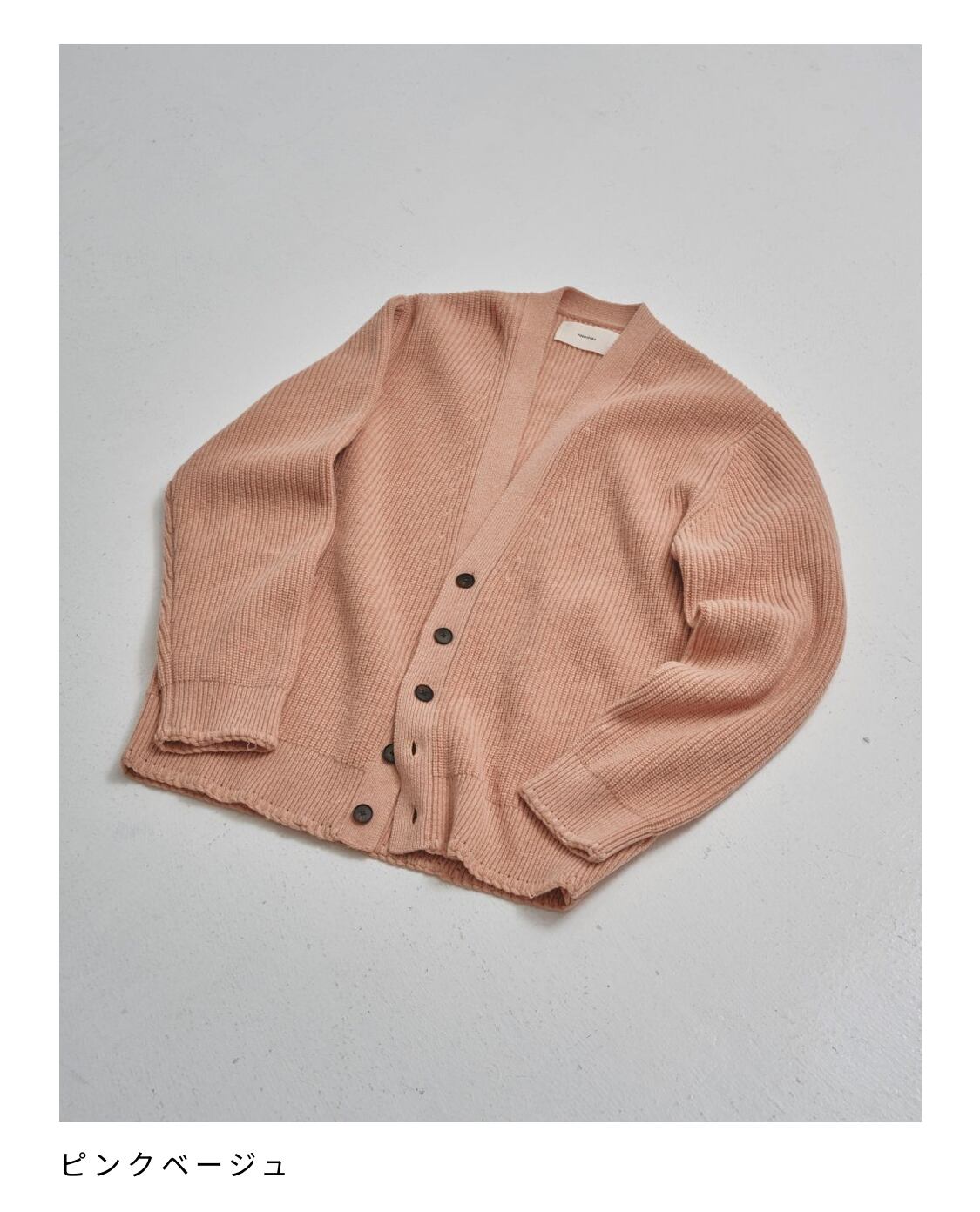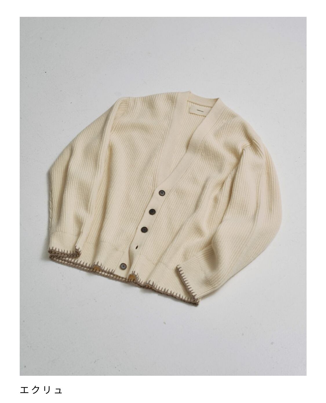 ラムウール混の糸で編み上げたリブニットカーディガン。程良く厚みのある編地が立体的なシルエットを生み、身体を包み込むような柔らかさも魅力。袖口と裾にあしらった繊細なハンドステッチが、控えめながらも印象的なアクセントに。肩のラインが落ちたゆるっとしたサイズは程良く力の抜けた印象で、パンツと合わせたマニッシュな着こなしはもちろん、インナーにビスチェを合わせて肌見せで抜け感をプラスするスタイリングもおすすめです。