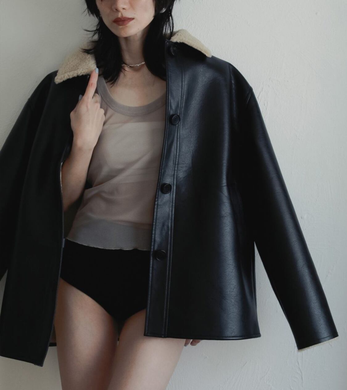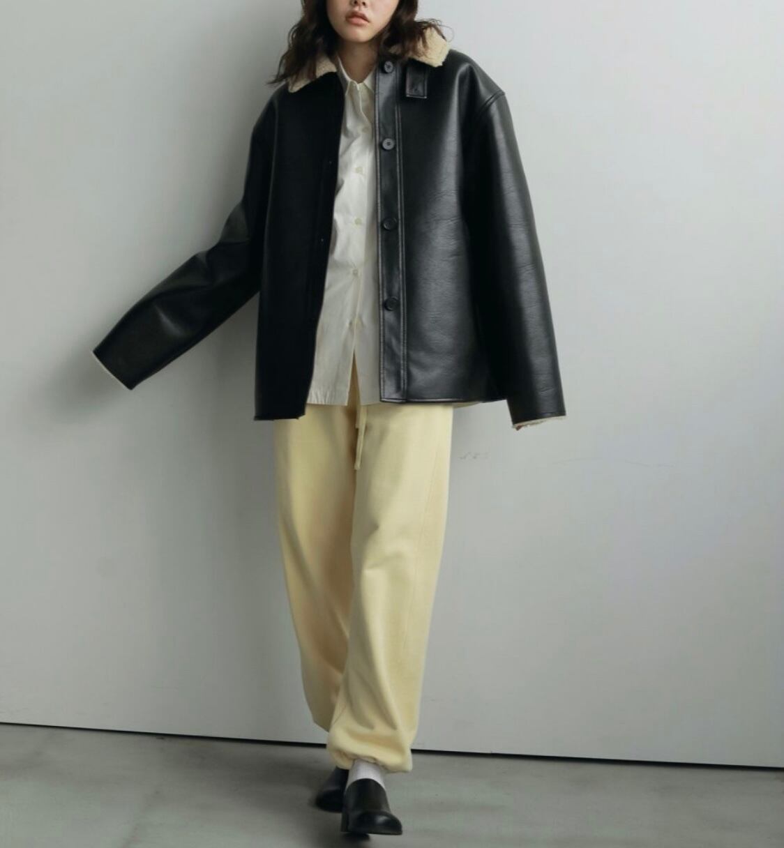 ボアカラーがポイントのエコシアリングジャケット。上品なシボ感と重厚感ある上質なエコレザーに、程良い粒感のボア素材をボンディングした生地です。フライトジャケットデザインとワイドシルエットでメンズライクに仕上げました。襟を立ててタブを留めて着るのもおすすめ。ボア面が首元を包み込み、寒い日も暖かく過ごしていただけます。
