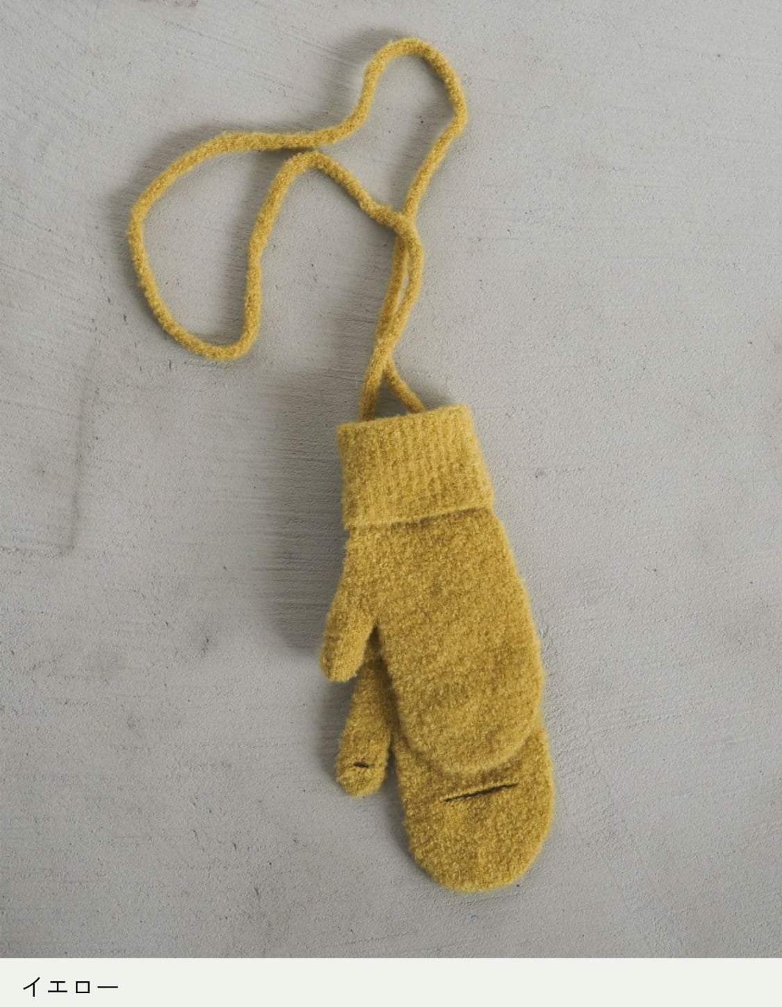 柔らかなループヤーンで、もこもことした編み地で仕上げたニットミトン。紐付きで、使わない際は首から垂らしてスタイリングのアクセントとしても。指を出せる穴付きで、親指にも開いているので、スマホ操作をする際等にも便利です。同じ糸で仕上げたBoucle Knit HoodieとSETで合わせていただくのもおすすめです。