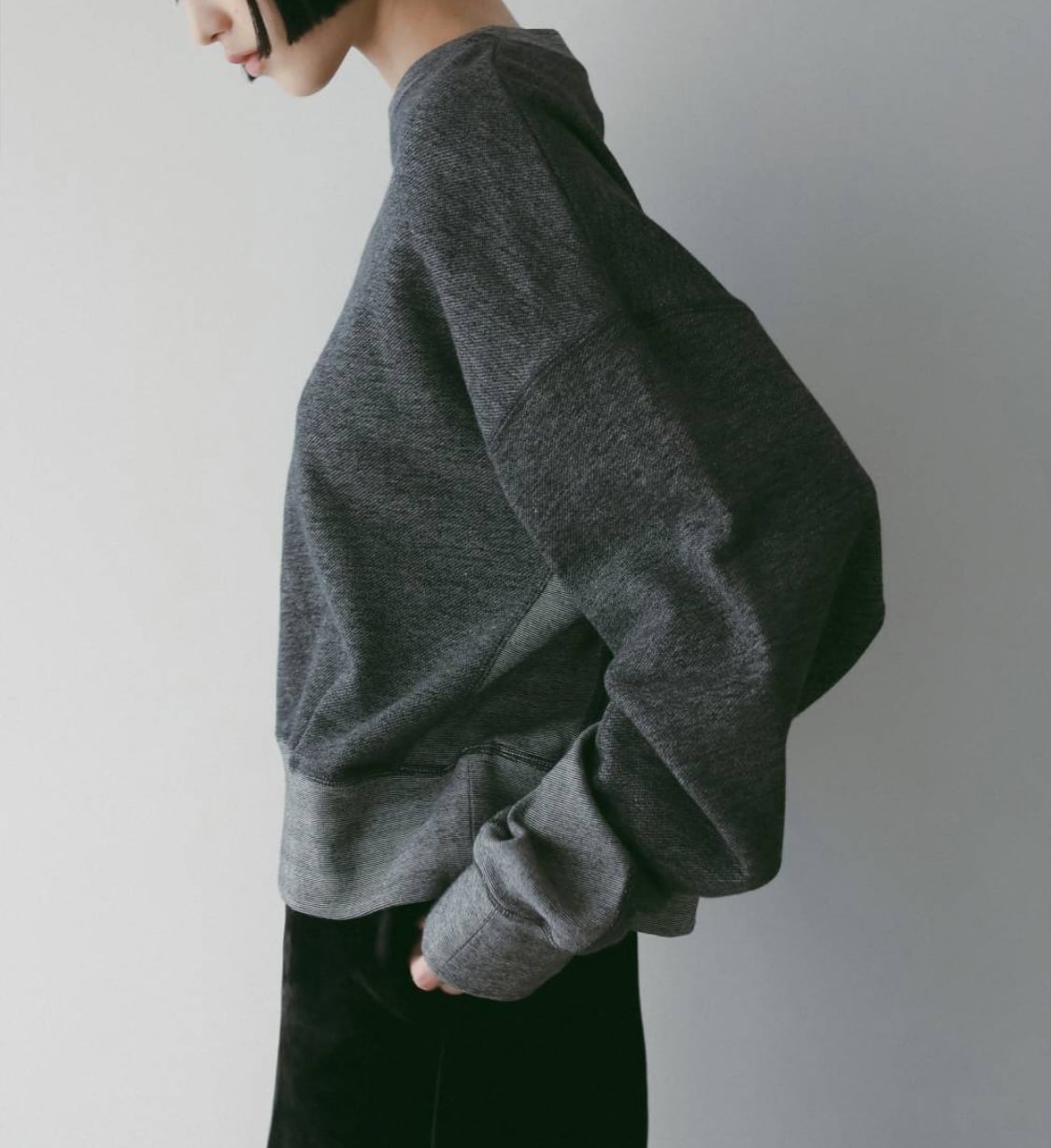 杢調の素材を使用した配色デザインがポイントのカットソートップス。身頃は裏毛素材、襟ぐりと袖口と脇パーツは変形リブを使用してます。どちらも同じ2色の糸をミックスさせて作りながらも、素材が変わるだけで色の見え方が異なる点を活かし、配色に仕上げたのがポイント。配色感が分かりやすいチャコールグレーと、微配色でシックな印象のブラウンの2色展開。切り替えには配色に合わせた表振りステッチを効かせています。幅広いボトムとバランス良く着ていただきやすい、短過ぎないショート丈で、ワイドなシルエットのラフな一枚。