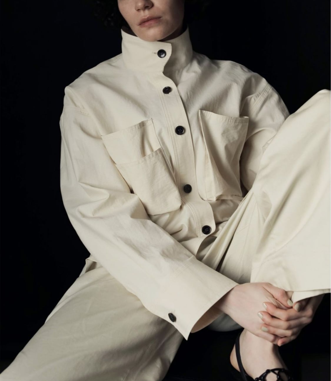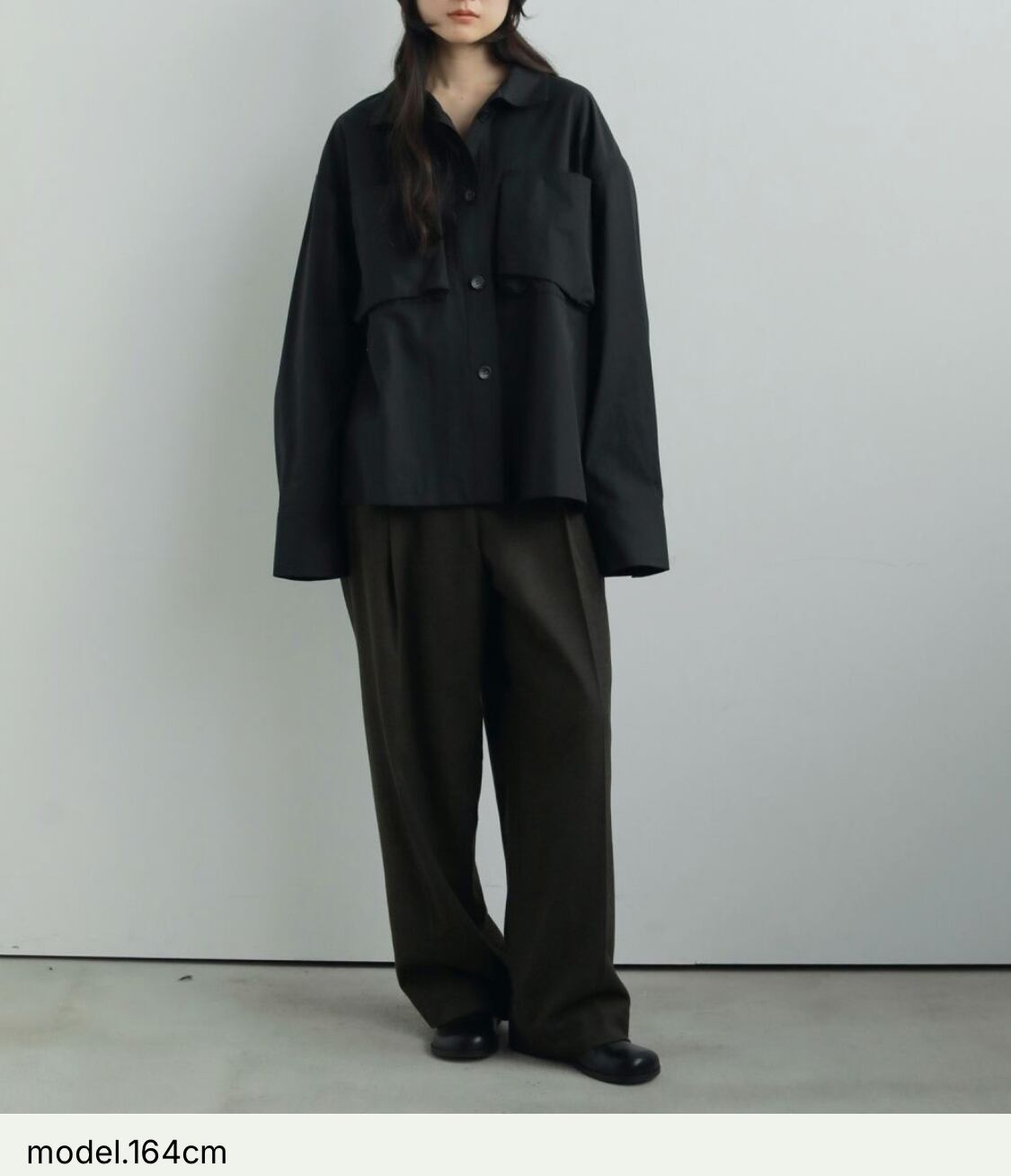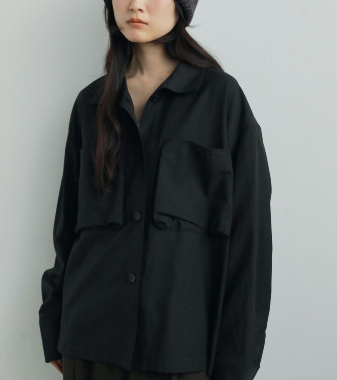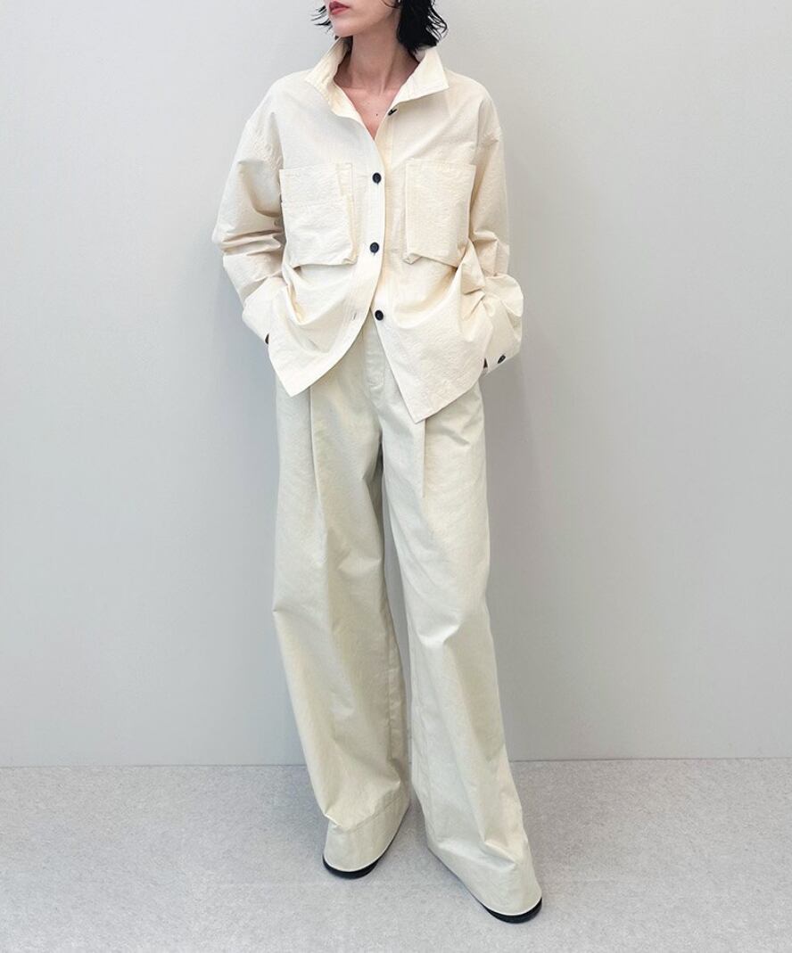 立体的なフロントポケットがポイントのスタンドカラーシャツ。少しハリのある綾目素材を使用しました。軽めの羽織としてもおすすめです。ボタンを全部閉じるとモードな印象に。上を開けて首元を見せると、抜け感がありこなれた印象に。大きめのフロントボタンで、アイボリーは配色ボタンがスタイリングのアクセントになります。シンプルなボトムに合わせるだけで、ニュアンスの出る一枚です。