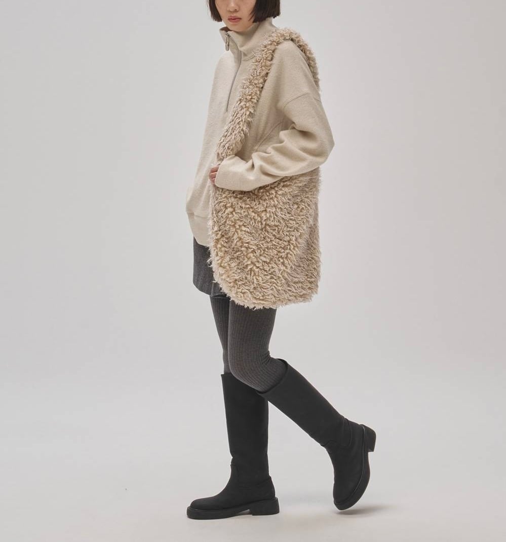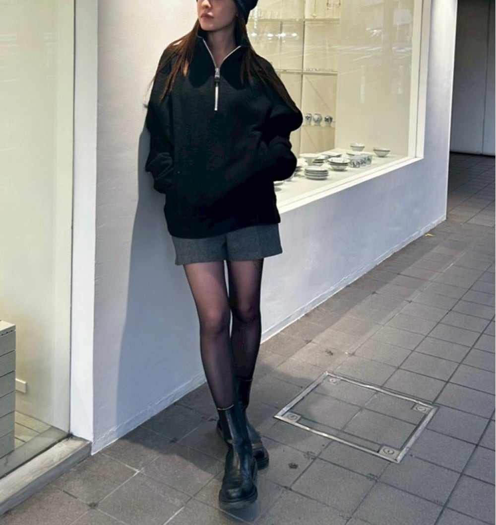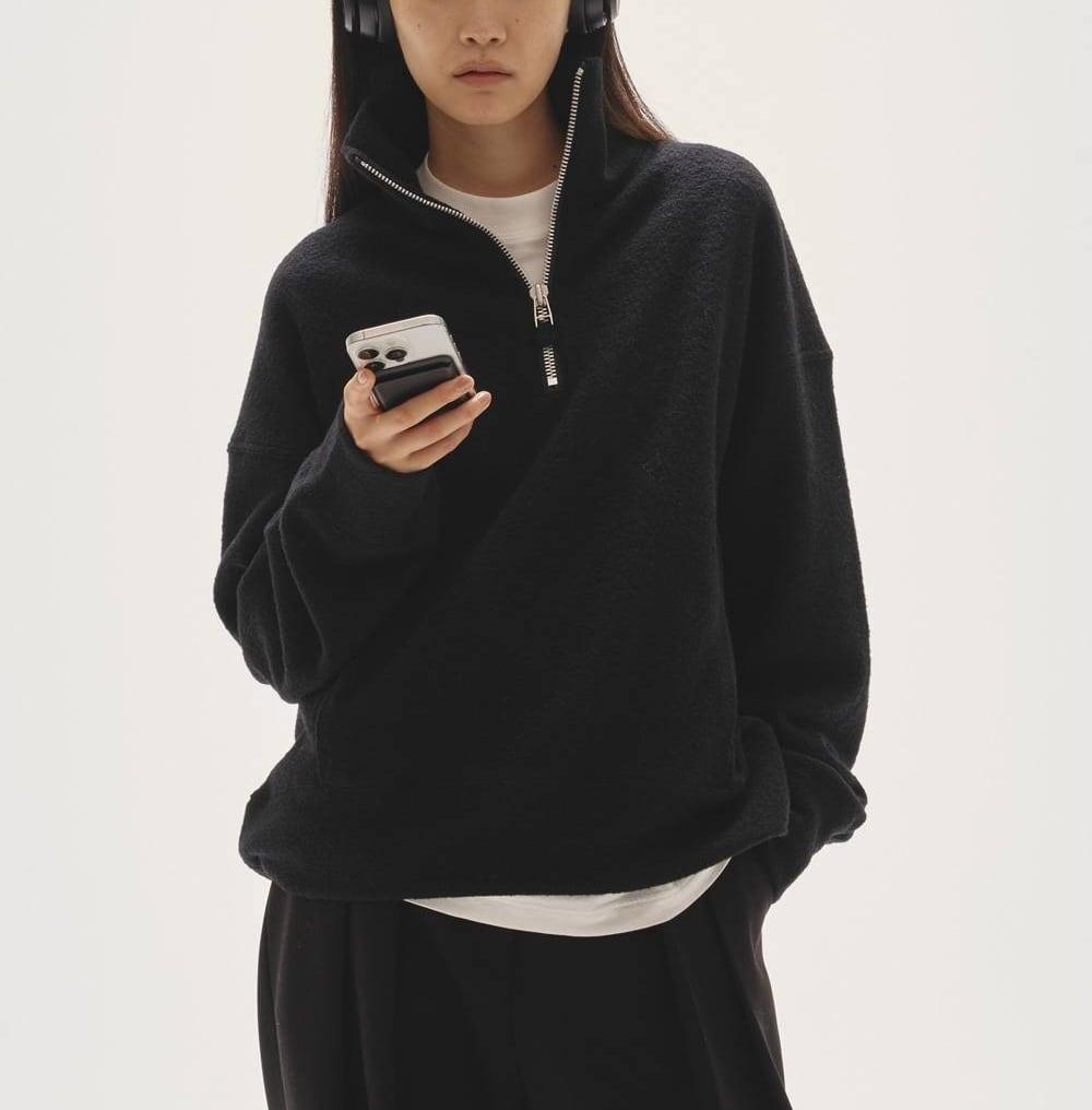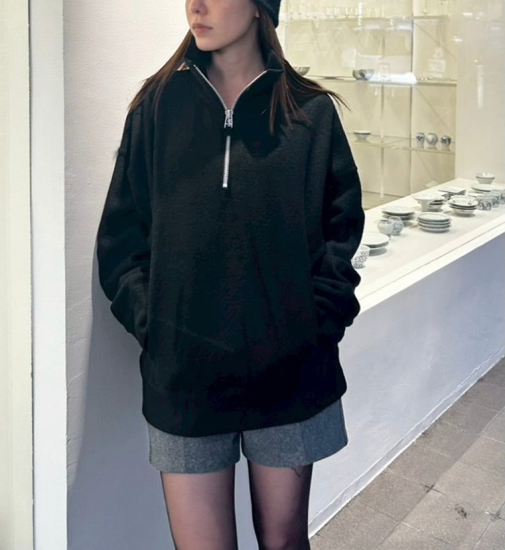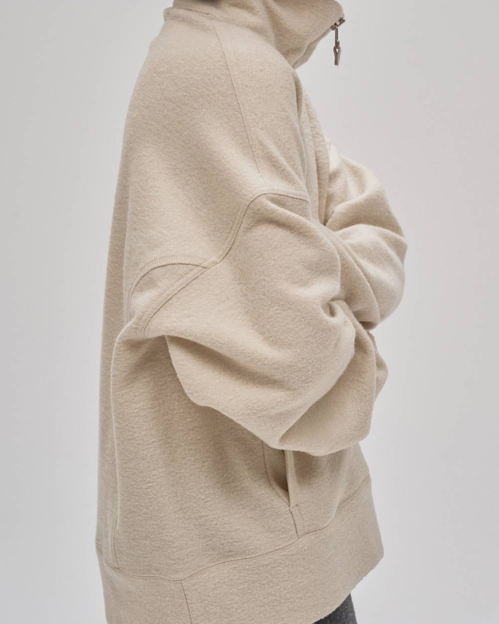 表情のあるウールジャージー素材を使用したハーフジッププルオーバー。切り替えラインに施したステッチや、スエード素材の引き手がさりげなくスタイリングのアクセントに。ゆるく落ちたショルダーラインと程良く短めの着丈が絶妙なバランスで、ラフさの中にもこなれ感を漂わせる一枚。