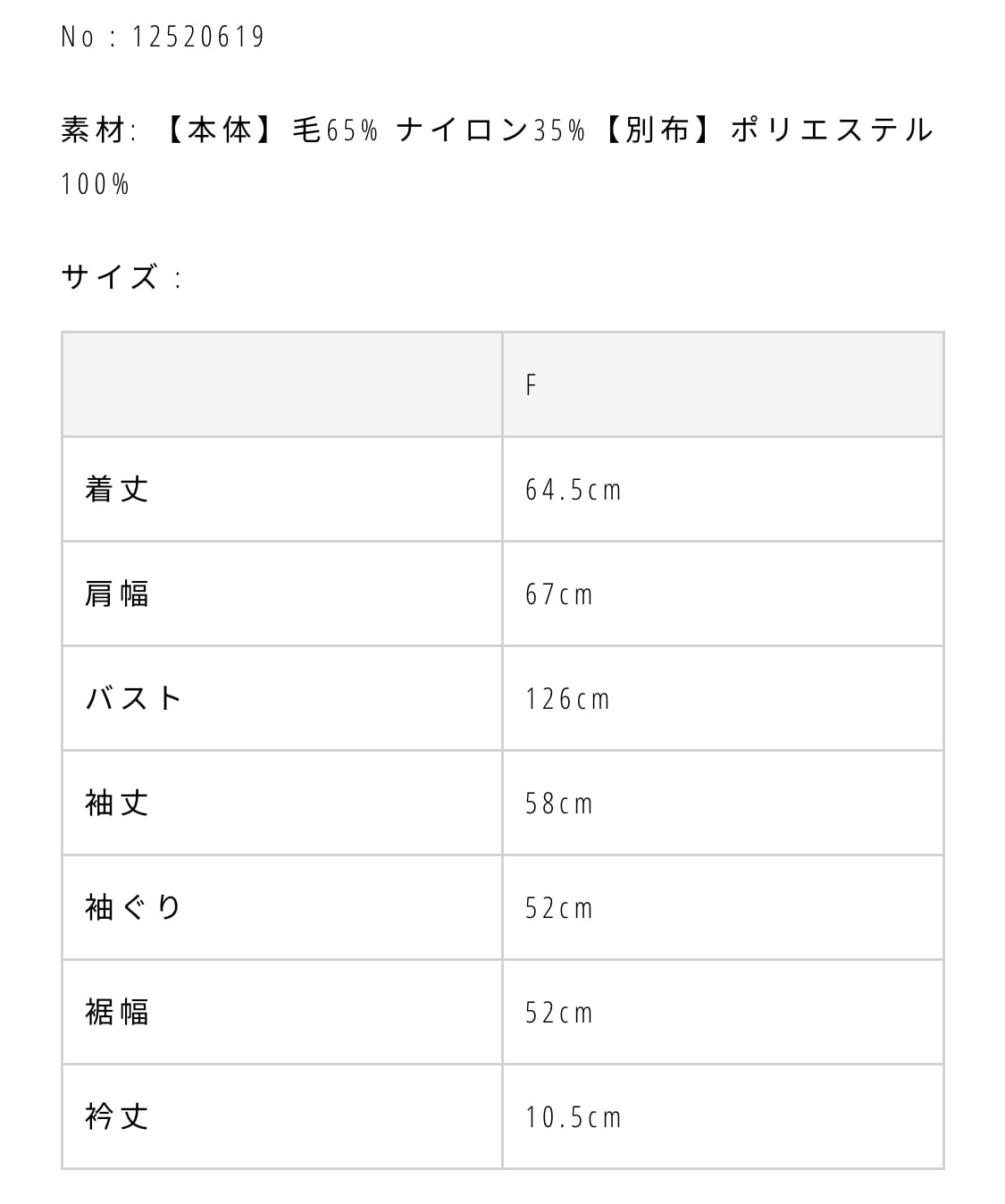 素材: 【本体】毛65% ナイロン35%【別布】ポリエステル100%