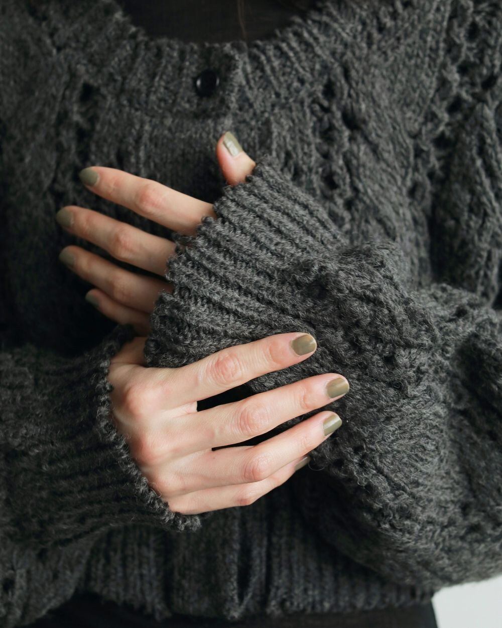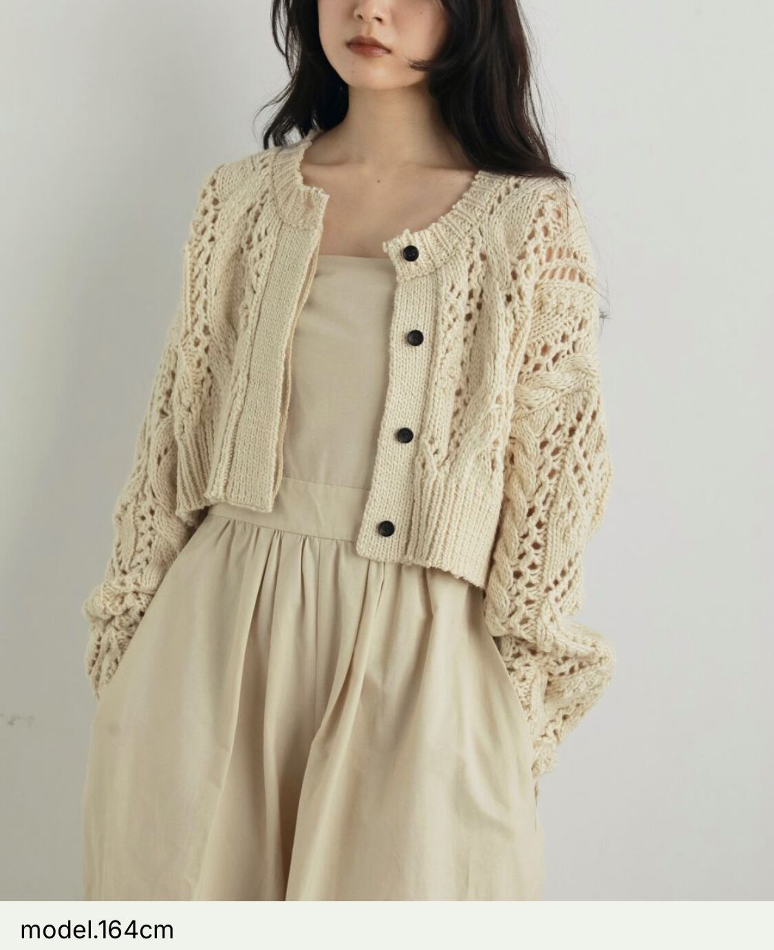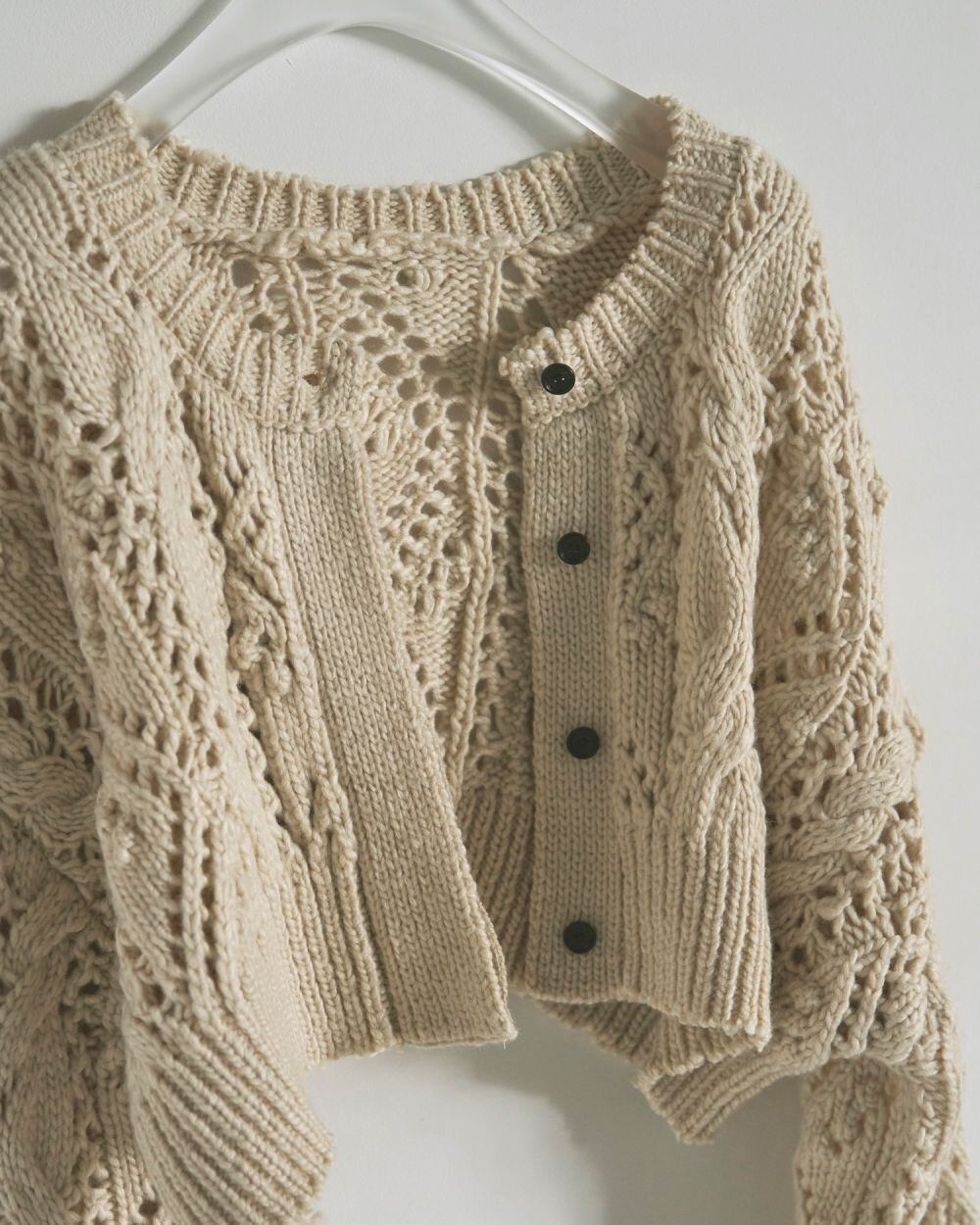 太めの糸でざっくりと編み上げたニットカーディガン。ケーブル編みをポイントに、様々な模様編みをミックスさせています。透かし編みもあり、軽やかで抜け感ある仕上がりに。襟や袖口、裾の端のカットオフディテールがラフで可愛い一枚。前後2WAYで着用可能なので、ボタンを留めてどちらを前にしてもプルオーバーとしても着ていただけます。同じ編み地のCable Knit CardiganやCable Knit Skirtとのセットで着ていただくのもおすすめです。
