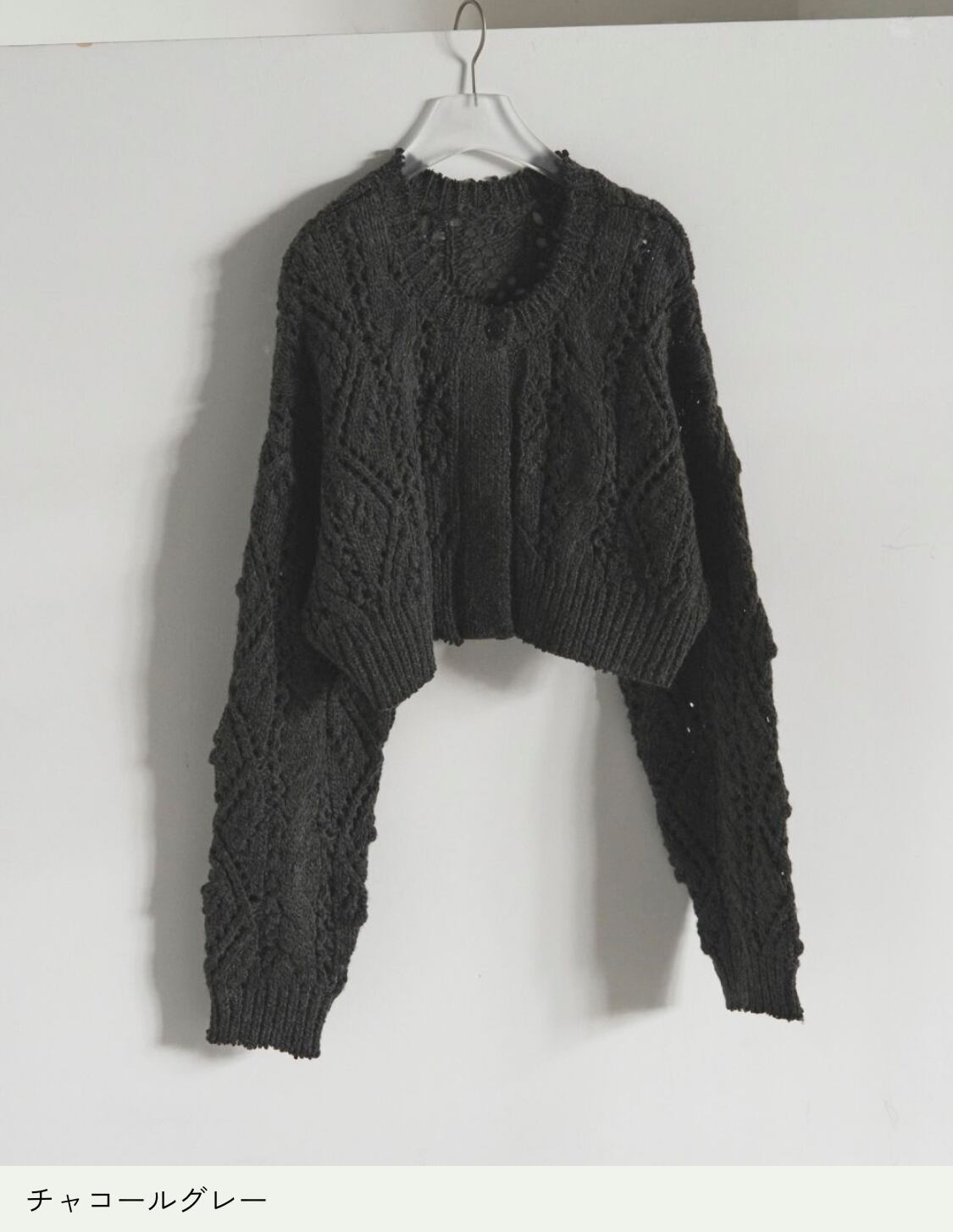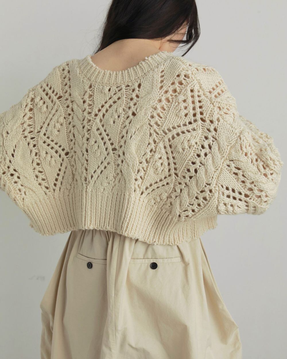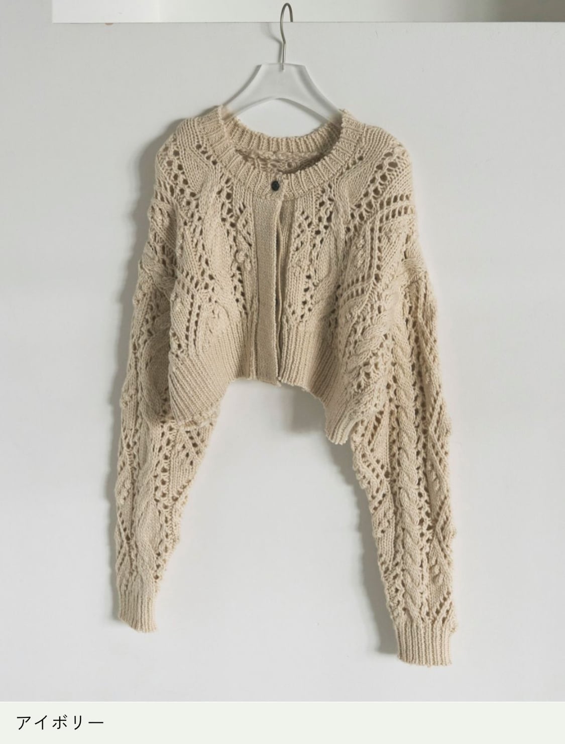 太めの糸でざっくりと編み上げたニットカーディガン。ケーブル編みをポイントに、様々な模様編みをミックスさせています。透かし編みもあり、軽やかで抜け感ある仕上がりに。襟や袖口、裾の端のカットオフディテールがラフで可愛い一枚。前後2WAYで着用可能なので、ボタンを留めてどちらを前にしてもプルオーバーとしても着ていただけます。同じ編み地のCable Knit CardiganやCable Knit Skirtとのセットで着ていただくのもおすすめです。