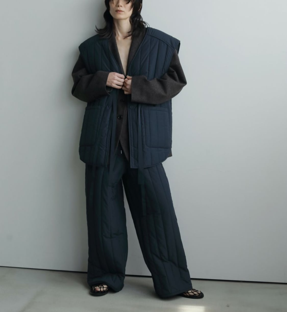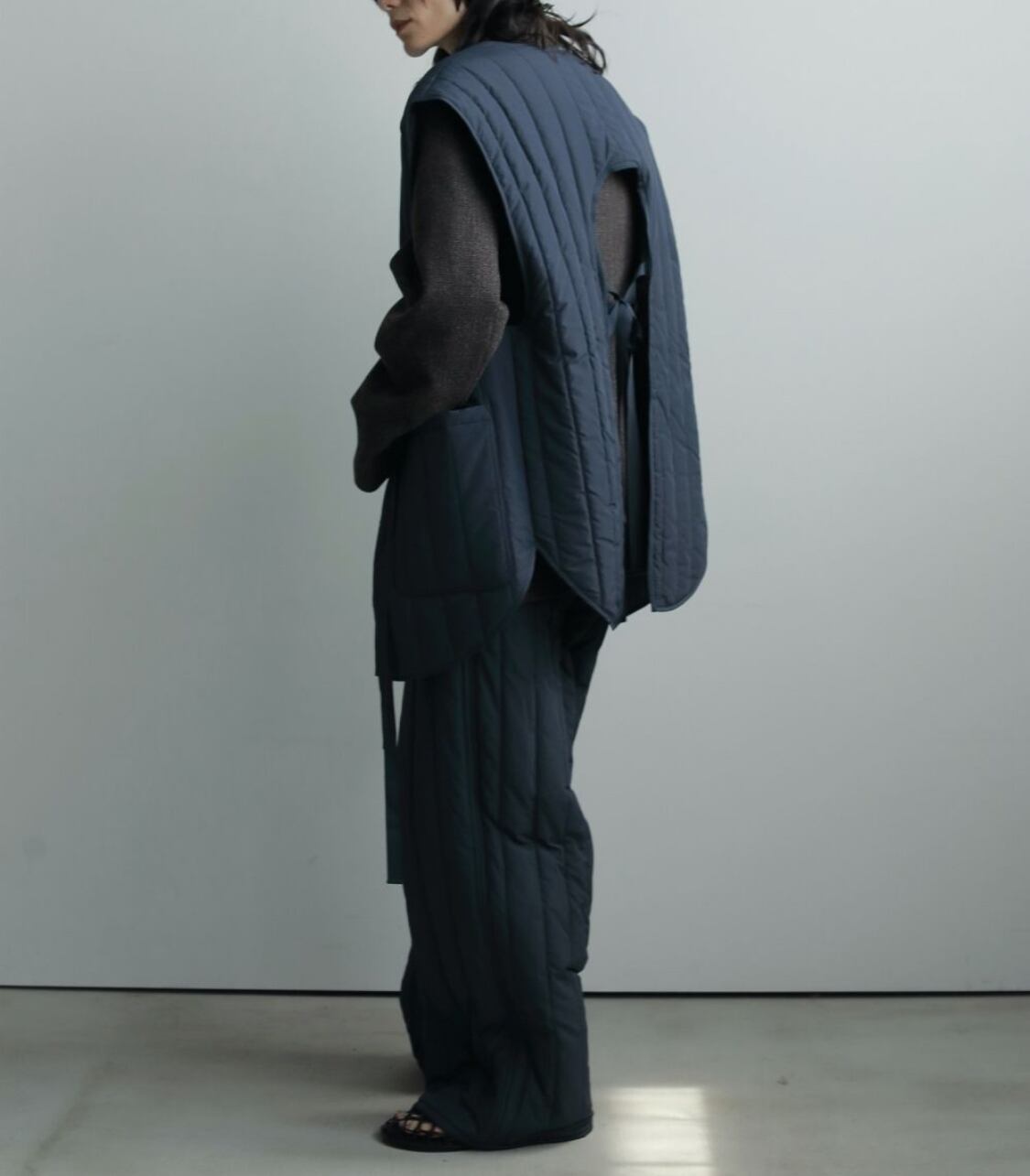 中綿を挟み込んだキルティング生地を使用したワイドパンツ。太巾ストライプのステッチワークで、スタイリングのポイントに。ウエストのドロストや裾のゴムコードでお好みのサイズに調節していただけます。暖かく、ストレスフリーな着心地。シンプルなニットやシャツと合わせるだけで着映える一本。同じキルティング素材でお作りしたBackopen Stripe Vestとセットで合わせていただくのもおすすめです。