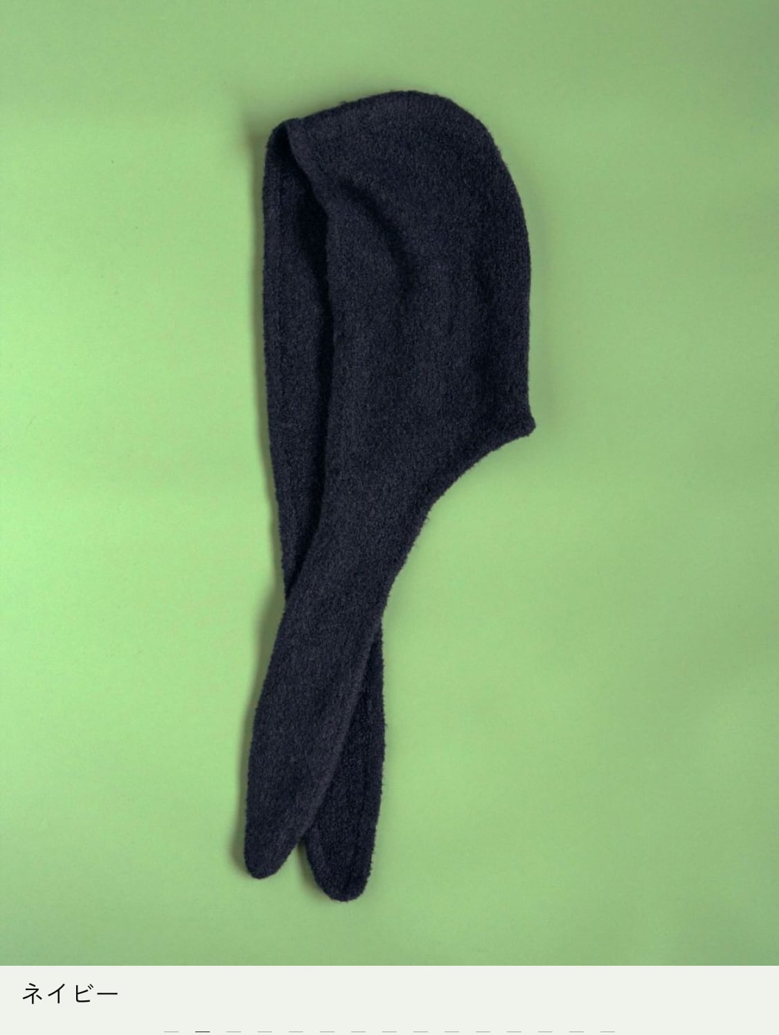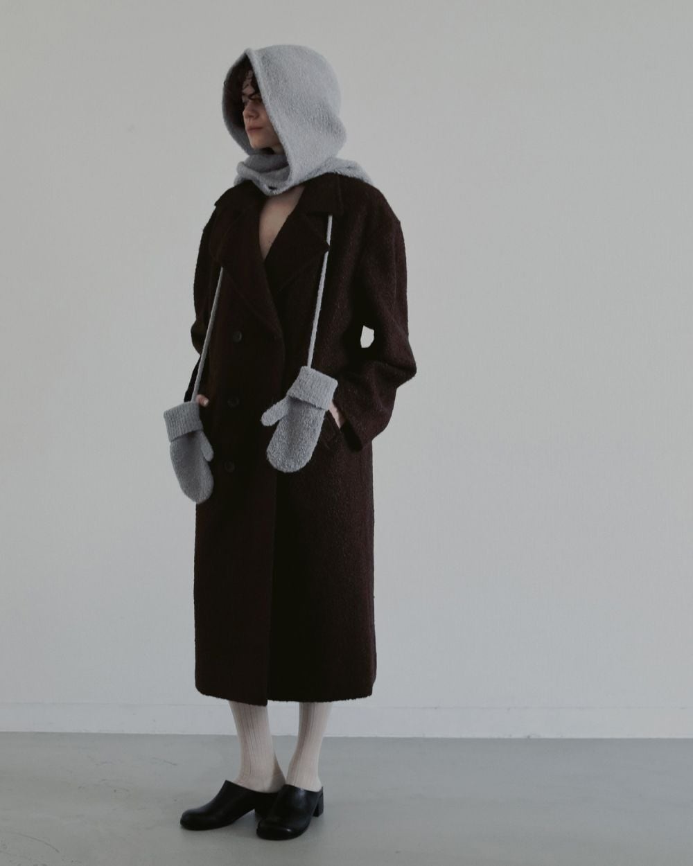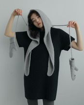 柔らかなループヤーンで、もこもことした立体的な編み地で仕上げたニットフーディー。フードから繋がるタイをそのまま垂らしたり、マフラーのように巻いたり、スタイリングのアクセントにアレンジ可能です。同じ糸を使用したBoucle Knit MittensとSETで合わせていただくのもおすすめ。肌寒い時期に耳まで隠れて暖かいのもポイントです。