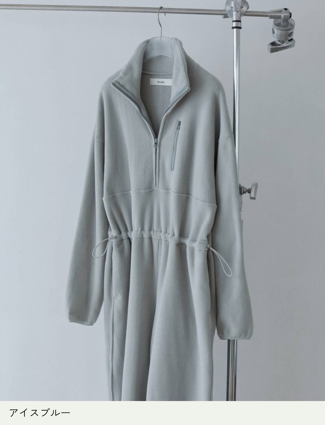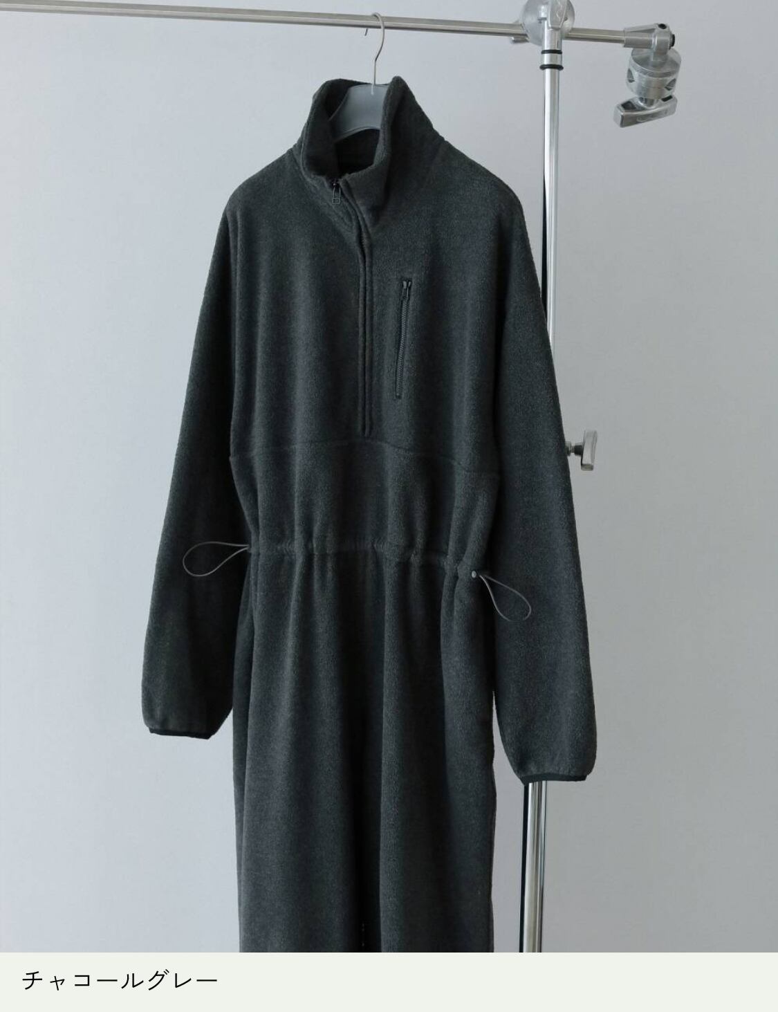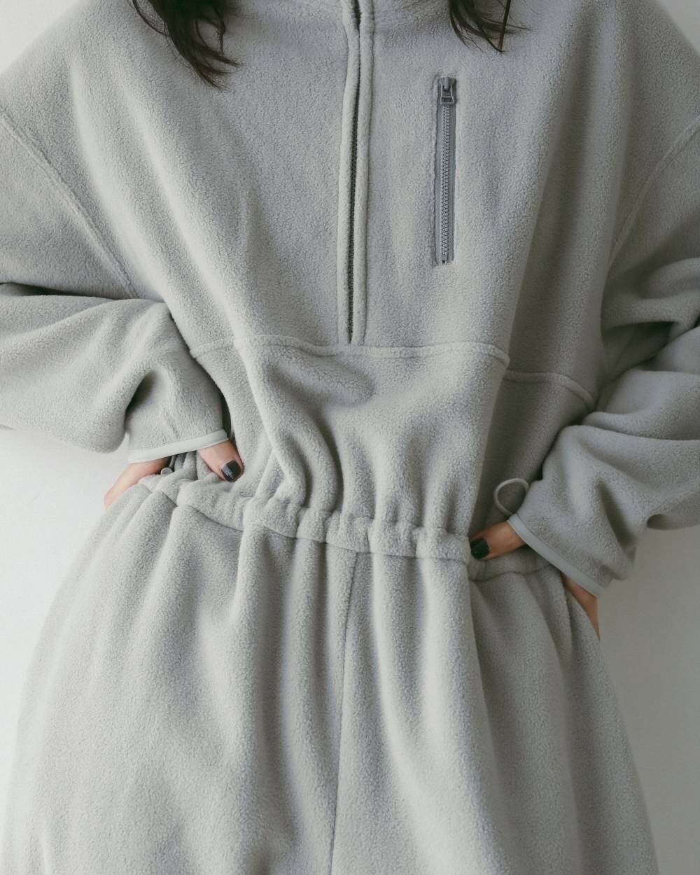 柔らかなフリース生地を使用したコンビネゾン。スタンドカラーのハーフZIPデザインで、アクティブな印象に仕上げました。ウエストと裾はドロスト仕様でお好みのシルエットに調節可能です。綺麗目のジャケットを羽織ったり、中にタートルや長袖Tシャツなどを合わせた、レイヤードスタイルで寒い時期も暖かく過ごしていただけます。普段着使いはもちろん、キャンプなどのアウトドアシーンにもおすすめです。