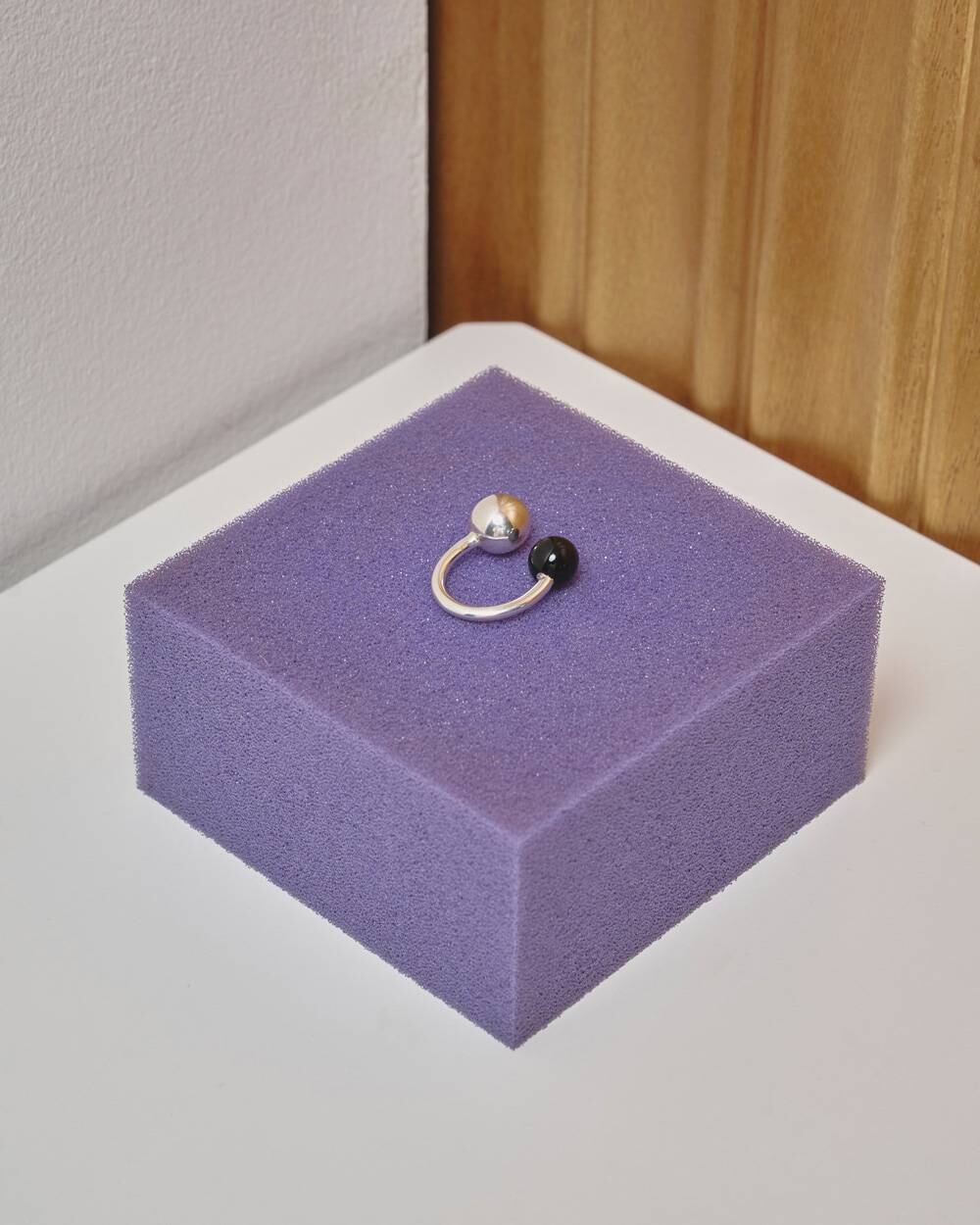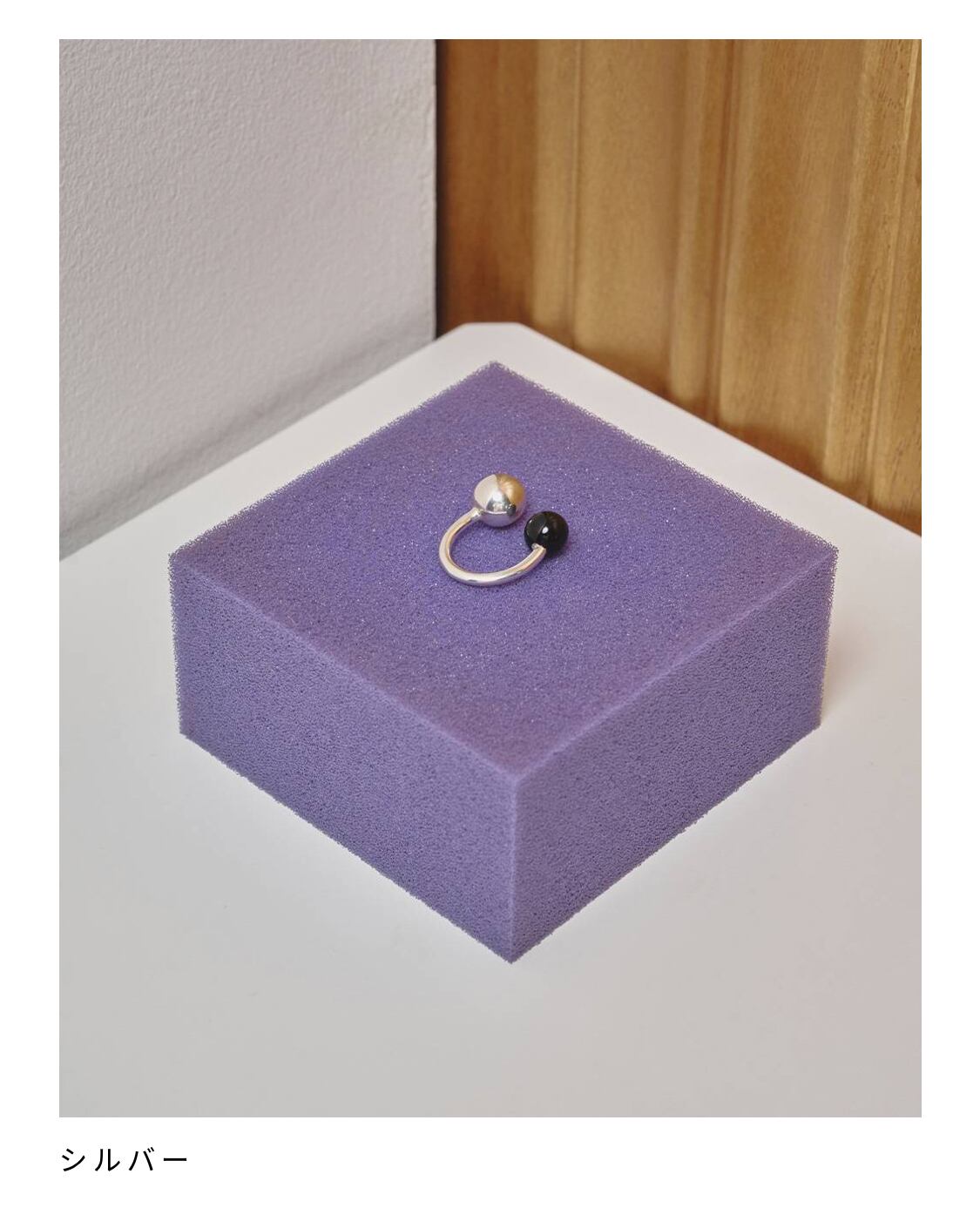 大きさの異なるボールモチーフが印象的なリング。小さいボールにはブラックコーティングを施し、洗練された配色に仕上げています。カジュアルなスタイルにさりげなく取り入れるだけで、こなれた雰囲気を演出。素材にはSilver925を使用しており、使い込むほどに独自のくすみなど経年変化を楽しんでいただけます。