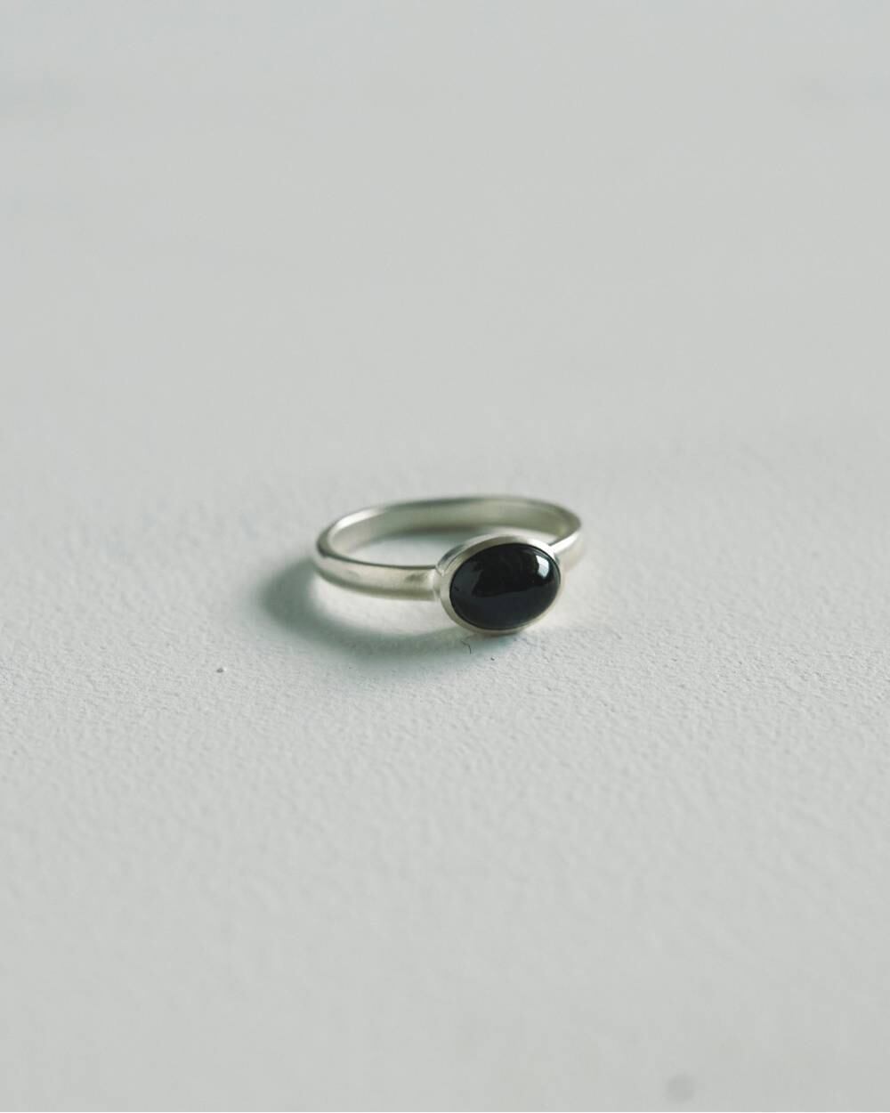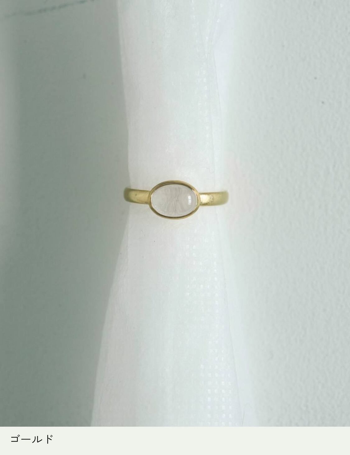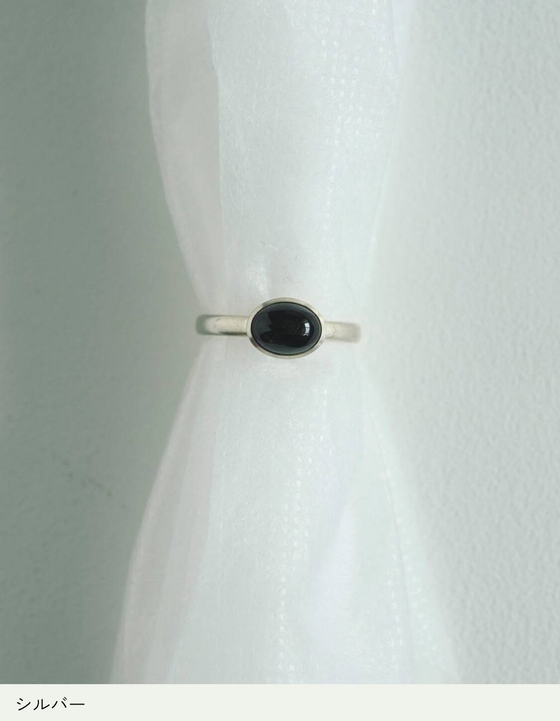 フロントの天然石が主役のリング。シルバーはオニキス、ゴールドはクリスタルをセットしました。さりげなく主張する楕円型のストーンが手元のポイントに。細めのリングでストーンも大き過ぎず、重ね付けするのもおすすめです。