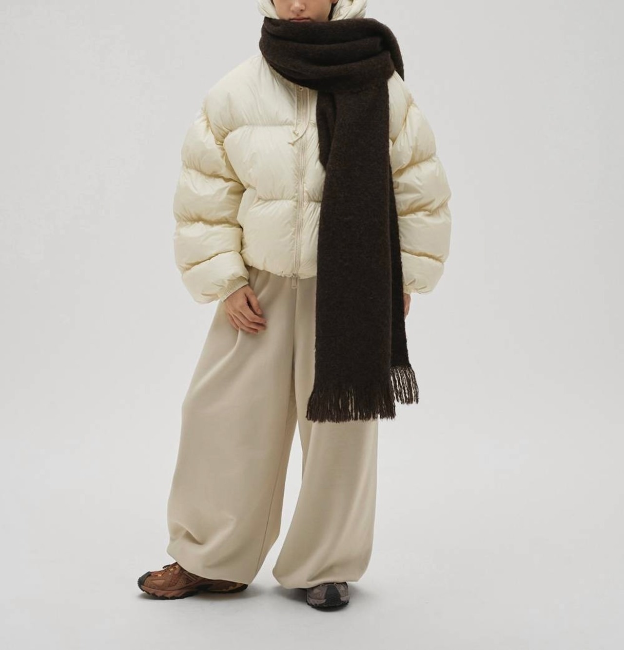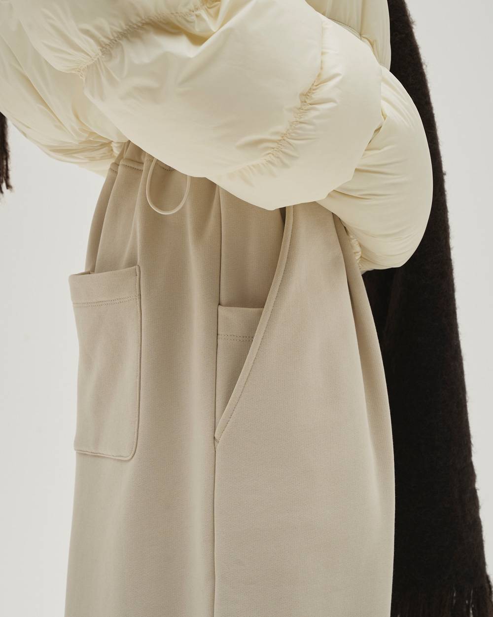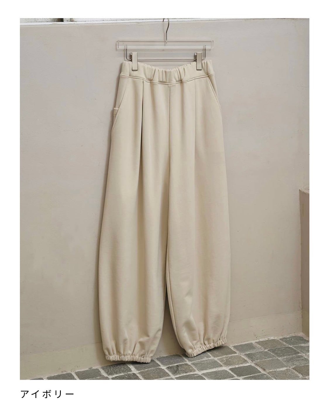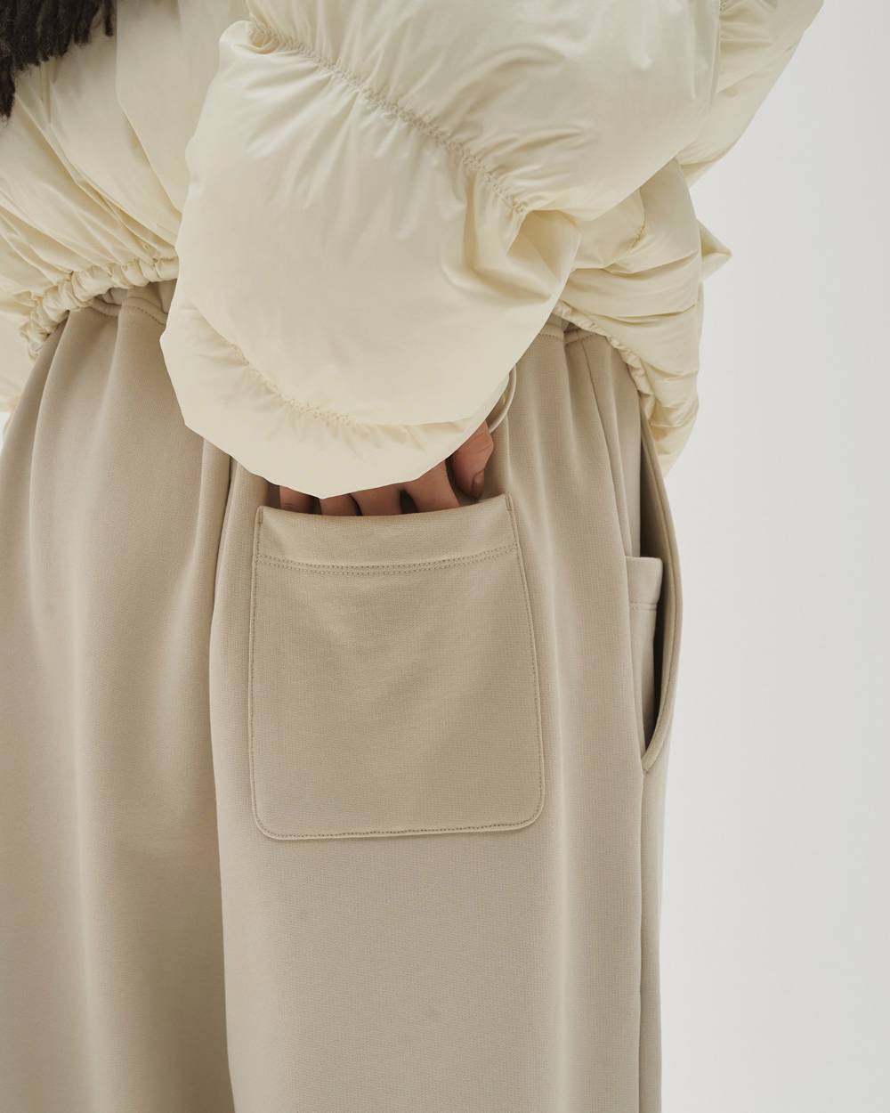 肉厚なスウェット素材を使用したタックワイドパンツ。落ち感のある素材が描く、ぽってりとした丸みのあるシルエットが魅力。ウエストはドロスト仕様で、気分や体型に合わせてフィット感の調整が可能で、裾に施したゴムが、足元に自然なボリュームとニュアンスを添えてくれます。短めの着丈のアウターと合わせるとバランスが良く、ダウンやレザーなどの重めなアイテムともすんなり馴染む一枚です。