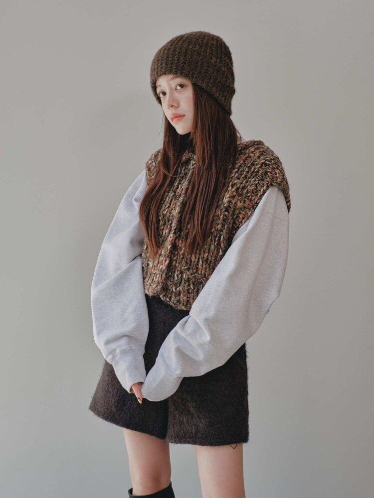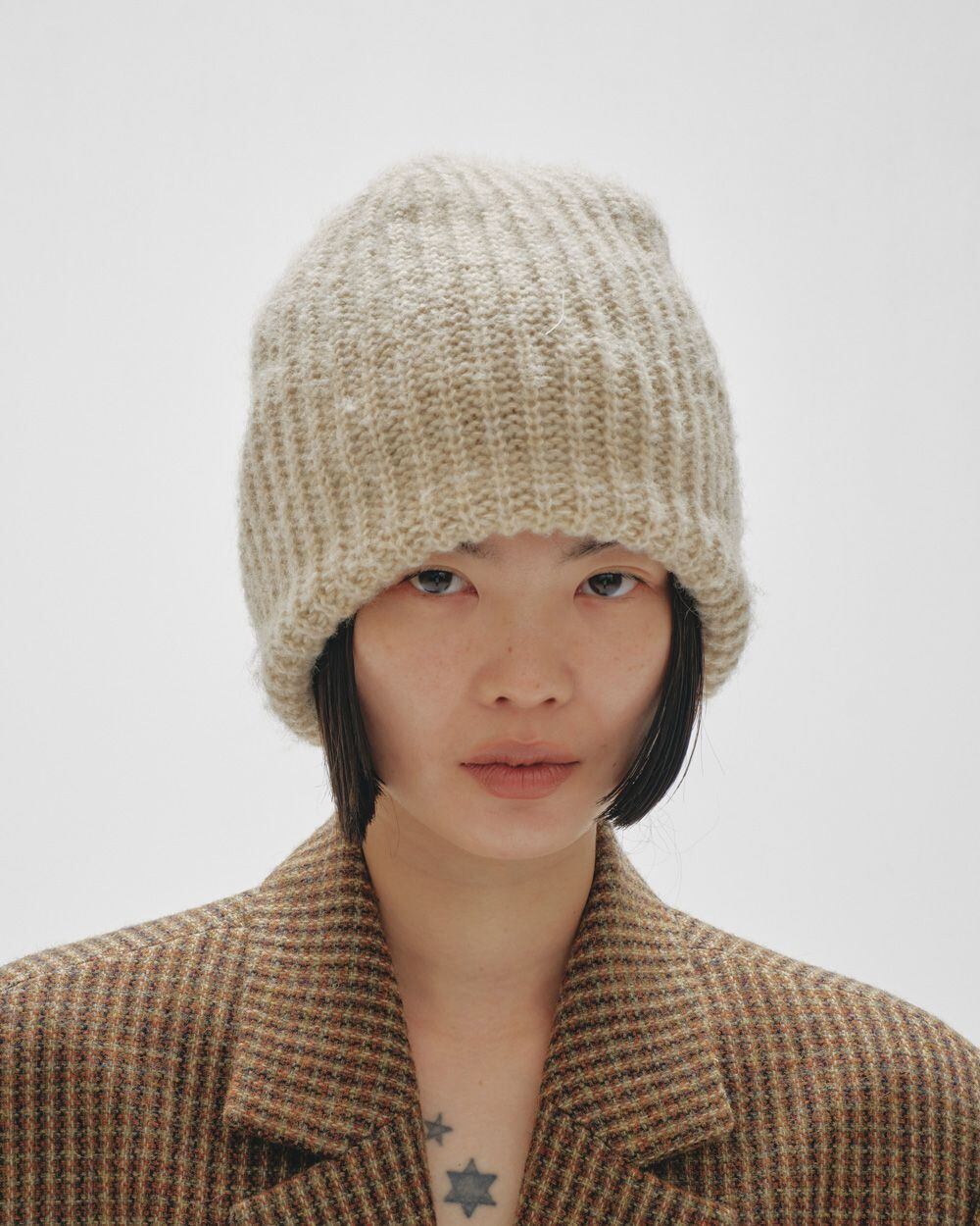 ボリューム感がかわいいニットビーニー。ざっくりとした編み地で、ふんわりとした柔らかい質感が魅力です。二重構造でボリュームのあるシルエットが、冬のスタイリングのアクセントになります。かっちりとしたジャケットスタイルの外しアイテムにもおすすめです。